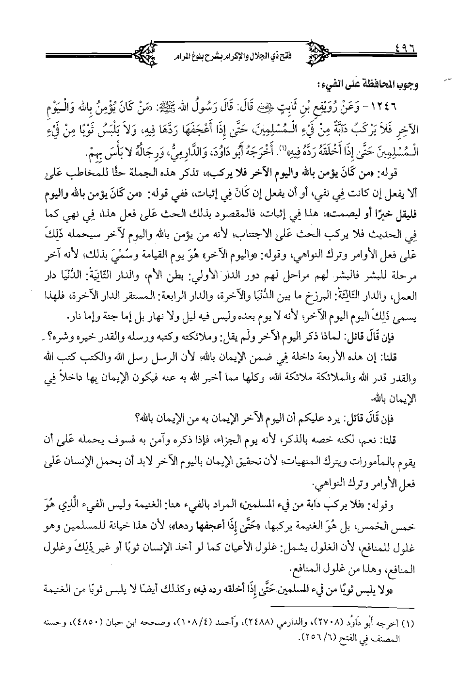 1246 - وعن رويفع بن ثابت (رضي الله عنه) قال: قال رسول الله (صلى الله عليه وسلم): "من كان يؤمن بالله واليوم الآخر لا يركب دابة من فيء المسلمين، حتى إذا أعجفها ردهًا فيه، ولا يلبس ثوبًا في فيء المسلمين حتى إذا أخلقه رده فيه" أخرجه أبو داود، والدرامي، ورجاله لا بأس بهم.