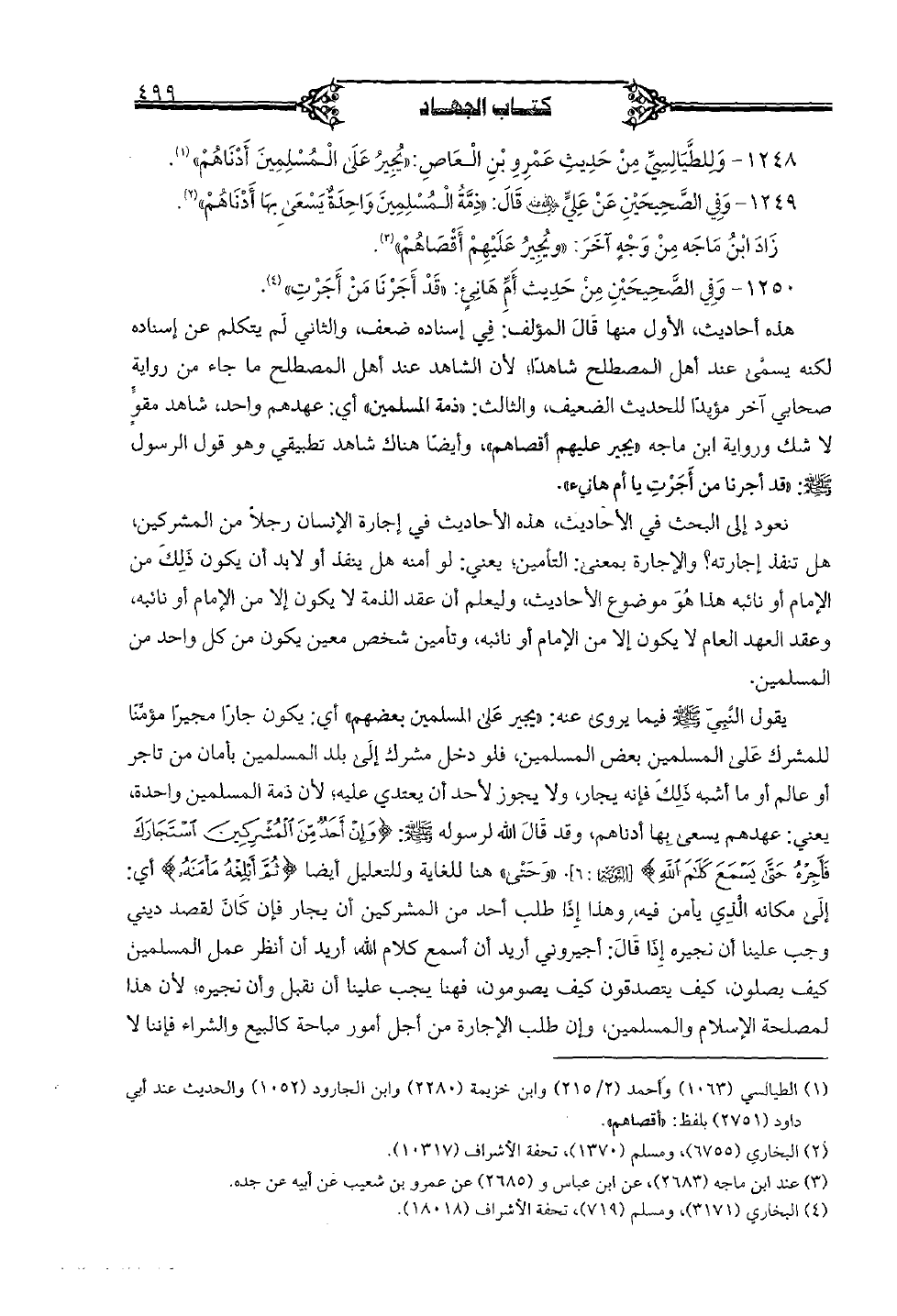 هذه أحاديث، الأول منها قال المؤلف: في إسناده ضعف، والثاني لم يتكلم عن إسناده لكنه يسمى عند أهل المصطلح شاهدًا؛ لأن الشاهد عند أهل المصطلح ما جاء من رواية صحابي آخر مؤيدًا للحديث الضعيف، والثالث: "ذمة المسلمين" أي: عهدهم واحد، شاهد مقو لا شك ورواية ابن ماجه "يجير عليهم أقصاهم"، وأيضا هناك شاهد تطبيقي وهو قول الرسول صلى الله عليه وسلم: "قد أجرنا من أجرت يا أم هانئ".
