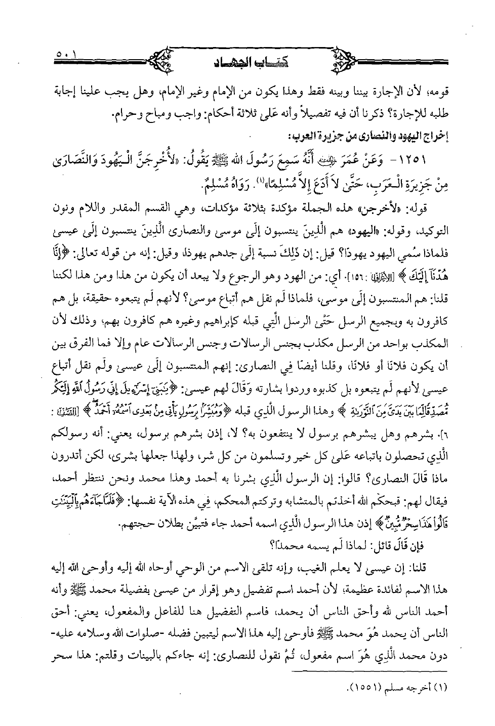 1251 - وعن عمر رضي الله عنه أنَّه سمع رسول الله صلى الله عليه وسلم يقول: "لأخرجنَّ اليهود والنَّصارى من جزيرة العرب، حتَّى لا أدع إلاَّ مسلمًا". رواه مسلم.
