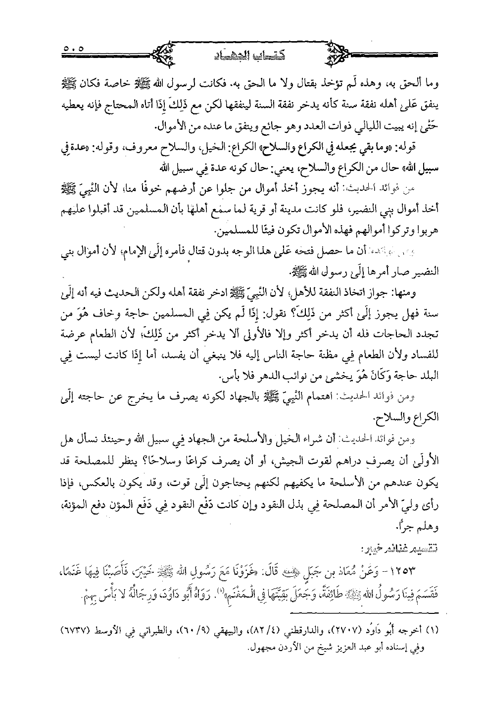 1253 - وعن معاذ بن جبلٍ رضي الله عنه قال: "غزونا مع رسول الله صلى الله عليه وسلم خيبر، فأصبنا فيها غنمًا، فقسم فينا رسول الله صلى الله عليه وسلم طائفةً، وجعل بقيتها في المغنم". رواه أبو داود، ورجاله لا بأس بهم