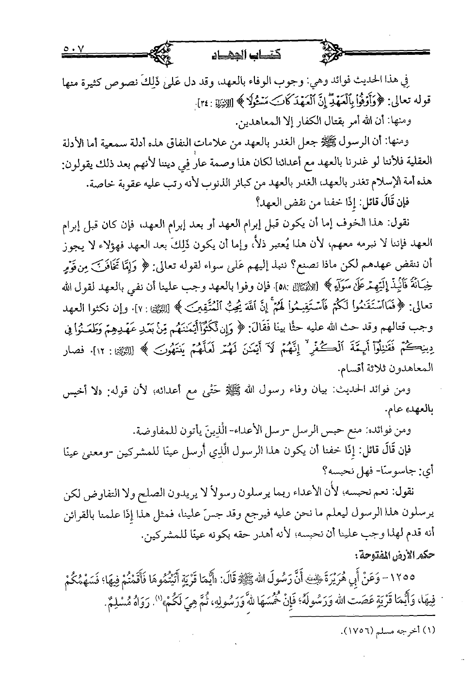 نقول: هذا الخوف إما أن يكون قبل إبرام العهد أو بعد إبرام العهد، فإن كان قبل إبرام العهد فإننا لا نبرمه معهم، لأن هذا يعتبر ذلاً، وإما أن يكون ذلك بعد العهد فهؤلاء لا يجوز أن ننقض عهدهم لكن ماذا نصنع؟ ننبذ إليهم على سواء لقوله تعالى: {وإمَّا تخافنَّ من قومٍ خيانةً فانبذّ إليهم على سواء} [الأنفال: 58]. فإن وفوا بالعهد وجب علينا أن نفي بالعهد لقول الله تعالى: {فما استقاموا لكم فاستقيموا لهم إنَّ الله يحبُّ المتقين} [التوبة: 7]. وإن نكثوا العهد وجب قتالهم وقد حث الله عليه حثًّا بينًا فقال: {وإن نَّكثوا أيمانهم من بعد عهدهم وطعنوا في دينكم فقاتلوا أئمَّة الكفر إنَّهم لا أيمان لهم لعلَّهم ينتهون} [التوبة: 12]. فصار المعاهدون ثلاثة أقسام.