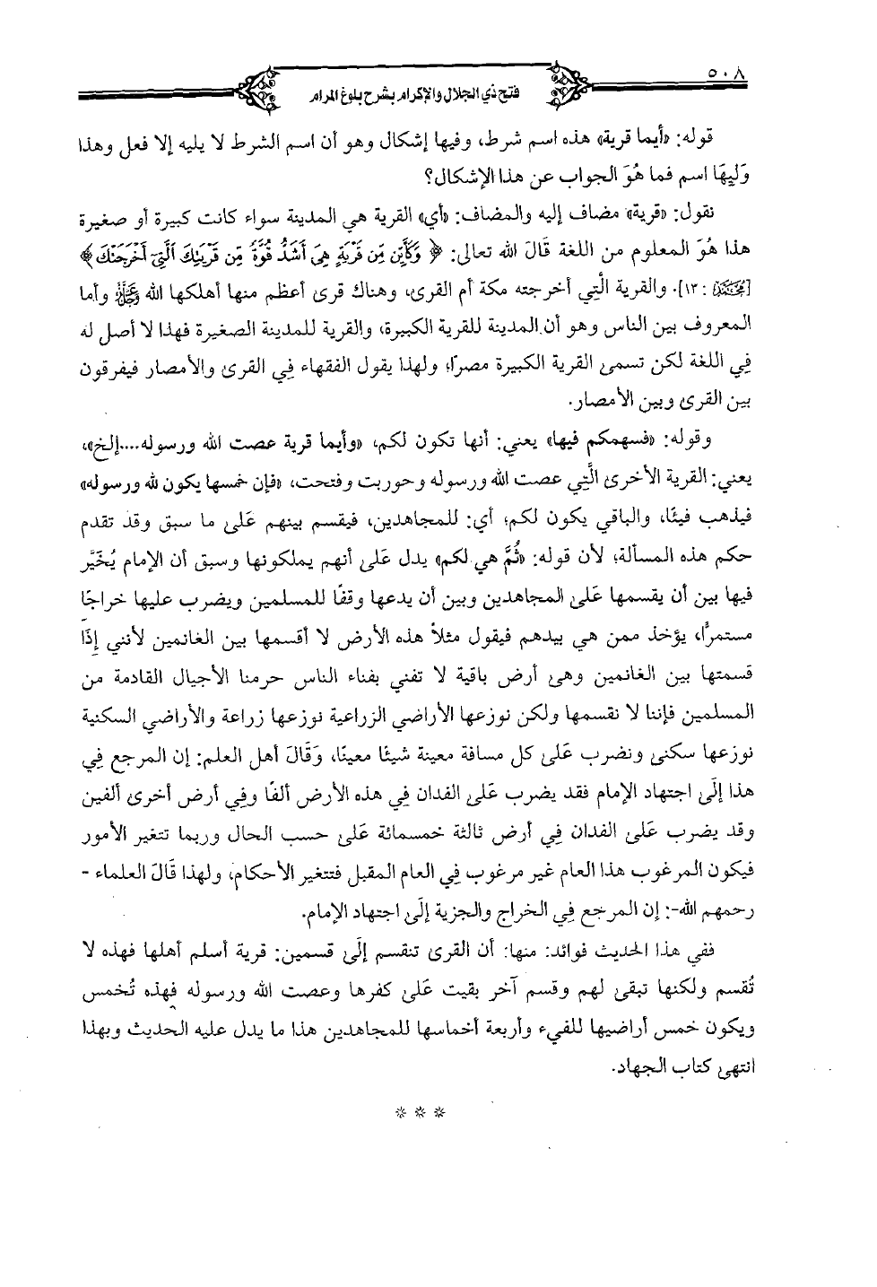 ففي هذا الحديث فوائد: منها: أن القرى تنقسم إلى قسمين: قرية أسلم أهلها فهذه لا تقسم ولكنها تبقى لهم وقسم آخر بقيت على كفرها وعصت الله ورسوله فهذه تخمس ويكون خمس أراضيها للفيء وأربعة أخماسها للمجاهدين هذا ما يدل عليه الحديث. وبهذا انتهى كتاب الجهاد.