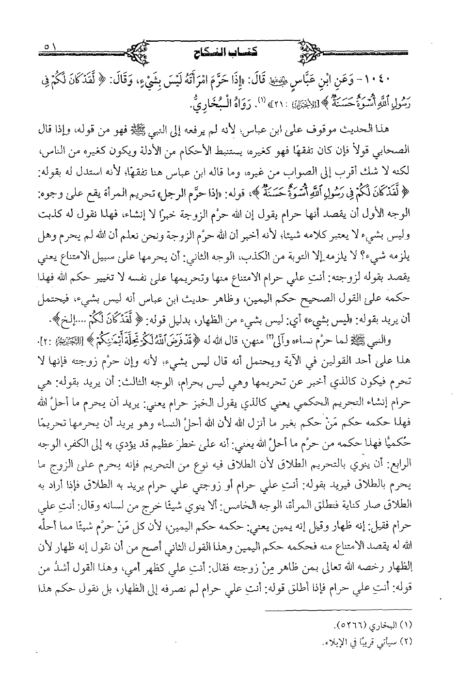 1040 - وعن ابن عباس رضى الله عنها قال: {إذا حرم امرأته ليس بشيء، وقال: {لقد كان لكم في رسول الله أسوة حسنة} [الأحزاب: 21]. رواه البخاري.