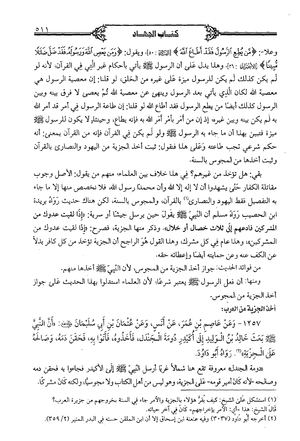 وعلا-: {مَّن يُطع الَّرسول فقد أطاع الله} [النساء: 80]. ويقول: {ومن يعص الله ورسوله فقد ضلَّ ضللاً مُّبينًا} [الأحزاب: 26]. وهذا يدل على أن الرسول صلى الله عليه وسلم يأتي بأحكام غير الَّتي في القرآن؛ لأنه لو لم يكن كذلك لم يكن للرسول ميزة على غيره من الخلق، لو قلنا: إن معصية الرسول هي معصية الله لكان الَّذي يأتي بعد الرسول وينهي عن معصية الله ثمَّ يعصى لا فرق بينه وبين الرسول كذلك أيضًا من يطع الرسول فقد أطاع الله لو قلنا: إن طاعة الرسول في أمر قد أمر الله به لم يكن بينه وبين غيره؛ إذ إن من أمر بأمر أمر الله به فإنه يطاع، وحينئذٍ لا يكون للرسول صلى الله عليه وسلم ميزة فتبين بهذا أن ما جاء به الرسول صلى الله عليه وسلم ولو لم يكن في القرآن فإنه من القرآن بمعنى: أنه حكم شرعي تجب طاعته وعلى هذا فنقول: ثبت أخذ الجزية من اليهود والنصارى بالقرآن وثبت أخذها من المجوس بالسنة.
