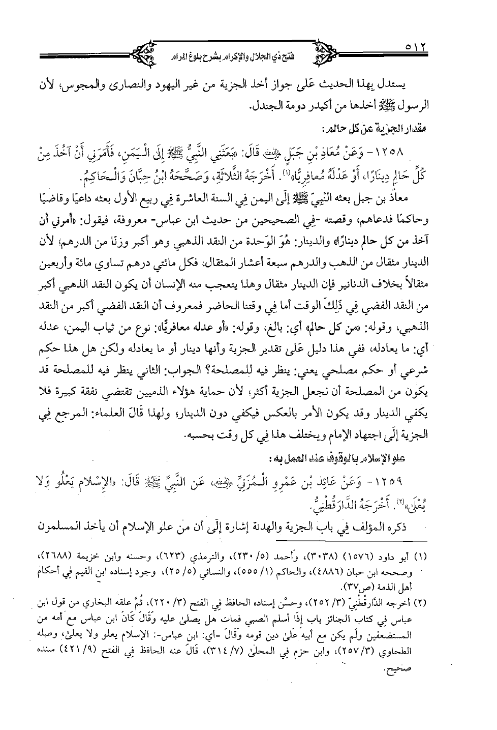 1258 - وعن معاذ بن جبل رضي الله عنه قال: "بعثني النَّبيّ صلى الله عليه وسلم إلى اليمن، فأمرني أن آخذ من كلِّ حالم دينارًا، أو عدله معافريًّا". أخرجه الثَّلاثة، وصحَّحه ابن حبَّان والحاكم.