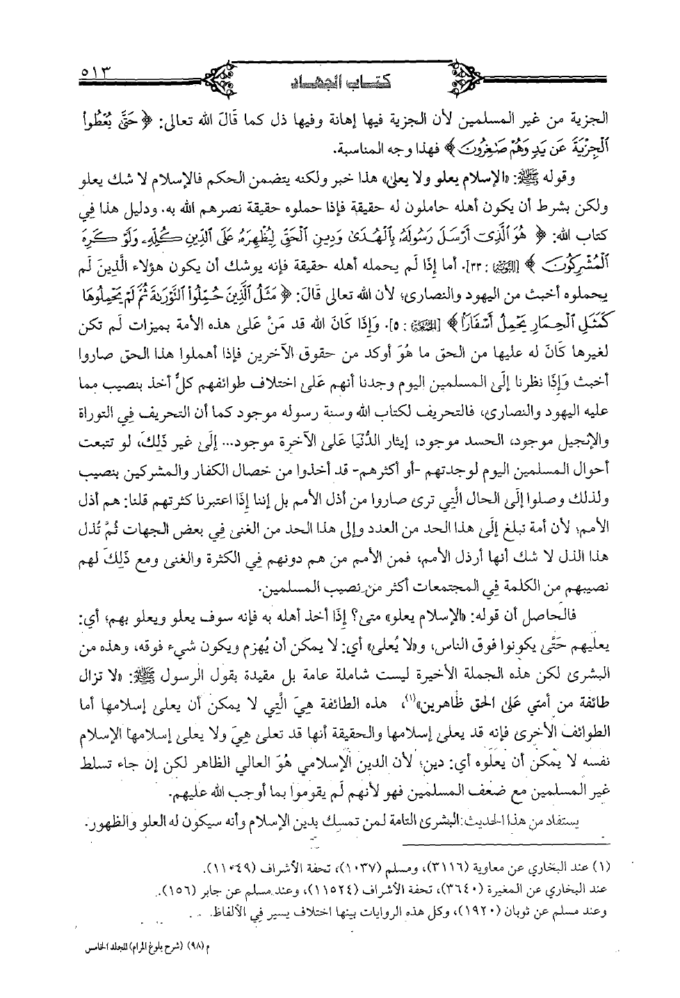 فالحاصل أن قوله: "الإسلام يعلو" متى؟ إذا أخذ أهله به فإنه سوف يعلو ويعلو بهم؛ أي: يعليهم حتَّى يكونوا فوق الناس، و"لا يعلى" أي: لا يمكن أن يهزم ويكون شيء فوقه، وهذه البشرى لكن هذه الجملة الأخيرة ليست شاملة عامة بل مقيدة بقول الرسول صلى الله عليه وسلم: "لا تزال طائفة من أمتي على الحق ظاهرين"، هذه الطائفة هي الَّتي لا يمكن أن يعلى إسلامها أما الطوائف الأخرى فإنه قد يعلى إسلامها والحقيقة أنها قد تعلى هي ولا يعلى إسلامها الإسلام نفسه لا يمكن أن يعلوه أي: دين؛ لأن الدين الإسلامي هو العالي الظاهر لكن إن جاء تسلط غير المسلمين مع ضعف المسلمين فهو لأنهم لم يقوموا بما أوجب الله عليهم.