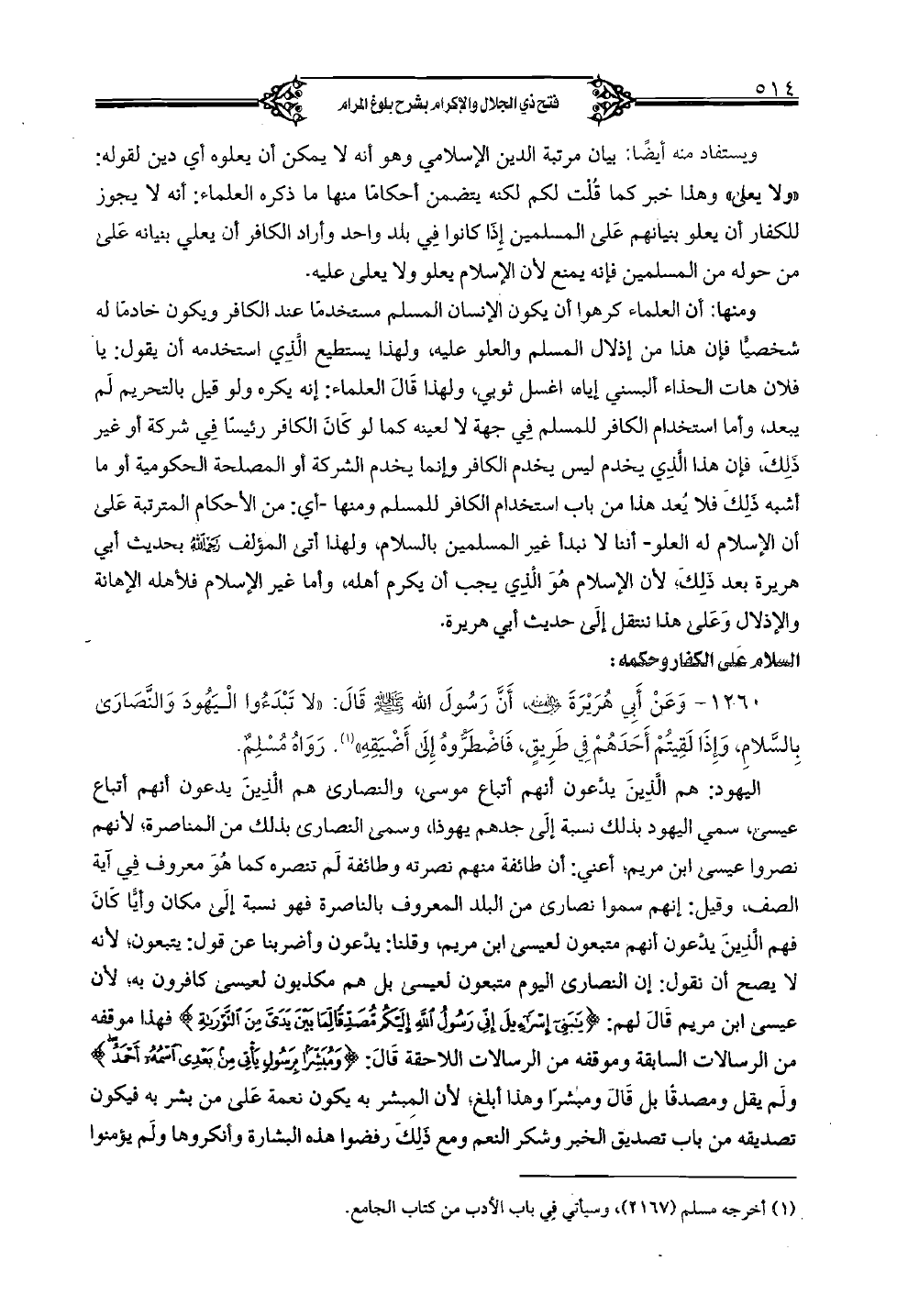 ومنها: أن العلماء كرهوا أن يكون الإنسان المسلم مستخدمًا عند الكافر ويكون خادمًا له شخصيًا فإن هذا من إذلال المسلم والعلو عليه، ولهذا يستطيع الَّذي استخدمه أن يقول: يا فلان هات الحذاء ألبسني إياه، اغسل ثوبي، ولهذا قال العلماء: إنه يكره ولو قيل بالتحريم لم يبعد، وأما استخدام الكافر للمسلم في جهة لا لعينه كما لو كان الكافر رئيسًا في شركة أو غير ذلك، فإن هذا الَّذي يخدم ليس يخدم الكافر وإنما يخدم الشركة أو المصلحة الحكومية أو ما أشبه ذلك فلا يعد هذا من باب استخدام الكافر للمسلم ومنها-أي: من الأحكام المترتبة على أن الإسلام له العلو- أننا لا نبدأغير المسلمين بالسلام، ولهذا أتى المؤلف رحمه الله بحديث أبي هريرة بعد ذلك؛ لأن الإسلام هو الذي يجب أن يكرم أهله، وأما غير الإسلام فلأهله الإهانة والإذلال وعلى هذا ننتقل إلى حديث أبي هريرة.