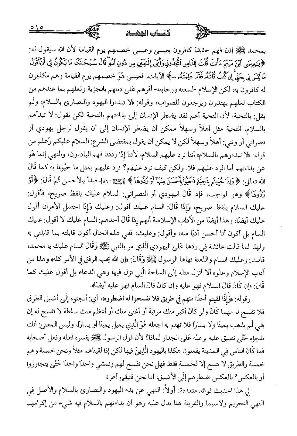 بمحمد صلى الله عليه وسلم إذن فهم حقيقة كافرون بعيسى وعيسى خصمهم يوم القيامة لأن الله سيقول له: } يا عيسى ابن مريم ءأنت قلت للناس اتخذونى وأمى إلهين من دون الله قال سبحانك ما يكون لى أن أقول ما ليس لي بحق إن كنت قلته فقد علمته ... {الآيات؛ فعيسى هو خصمهم يوم القيامة وهم مكذبون له كافرون به، لكن الإسلام - لسعته ورحابته - أقرهم على دينهم بالجزية ولعلهم بما عندهم من الكتاب لعلهم يهتدون ويرجعون للصواب، وقوله: "لا تبدءوا اليهود والنصارى بالسلام" ولم يقل: بالتحية؛ لأن التحية أعم فقد يضطر الإنسان إلى بداءتهم بالتحية لكن نقول: لا تبدأهم بالسلام، التحية مثل أهلًا وسهلًا ممكن أن يضطر الإنسان إلى أن يقول لرجل يهودي أو نصراني أو وثني: أهلًا وسهلًا لكن لا يمكن أن يقول بمقتضى الشرع: السلام عليكم وعلم من قوله: "لا تبدءوهم بالسلام" أننا نرد عليهم السلام؛ لأننا إذا رددنا فهم البادءون، والنهي إنما هو عن بداءتهم أما الرد عليهم فلا. ولكن كيف نرد عليهم؟ نرد عليهم بمثل ما حيَّونا به كما قال الله تعالى: } وإذا حييتم بتحية فحيوا بأحسن منها أو ردوها {[النساء: 86]. فبدأ بالأحسن ثمَّ قال: } أو ردوها {وهو الواجب، فإذا قال اليهودي أو النصراني: السلام عليك بلفظ صريح، فأقول: عليك السلام بلفظ صريح، وإذا قال: السام عليك أقول: وعليك وإذا احتمل الأمران أقول عليك أيضاً، وهذا أيضاً من الآداب الإسلامية أنهم إذا قال أحدهم: السام عليك لا أقول: عليك السام بل أكون أنا أحسن أدباً منه، وأقول: وعليك، ففي هذه الحال أكون قابلته بما قابلني به ولهذا لما قالت عائشة في ردها على اليهودي الَّذي مر بالنبي صلى الله عليه وسلم وقال السام عليك يا محمد، قالت: وعليك السام واللعنة نهاها الرسول صلى الله عليه وسلم وقال: "إن الله يحب الرفق في الأمر كله" وهذا من آداب الإسلام وعلوه ألا أنزل مثله إلى الساحة التي نزل فيها وهي الدعاء بل أقول عليك كما قال: "إن كان قال السلام فهو عليه وإن كان قال السام فهو عليه أيضاً".