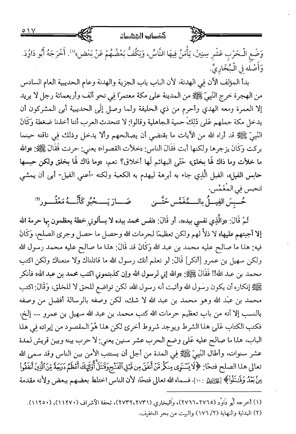 بدأ المؤلف الآن في الهدنة، لأن الباب باب الجزية والهدنة وعام الحديبية العام السادس من الهجرة خرج النَّبيّ صلى الله عليه وسلم من المدينة على مكة معتمرًا في نحو ألف وأربعمائة رجل لا يريد إلا العمرة ومعه الهدي وأحرم من ذي الحليفة ولما وصل إلّى الحديبية أبى المشركون أن يدخل مكة حملهم على ذلك حمية الجاهلية وقالوا: لا تتحدث العرب أننا أخذنا ضغطة وكان النَّبيّ صلى الله عليه وسلم قد أراه الله من الآيات ما يقتضي أن يصالحهم وألا يدخل وذلك في ناقته حينما بركت وكان يزجرها ولكنها أبت فقال الناس: "خلأت القصواء" يعني: حرنت فقال صلى الله عليه وسلم: "والله ما خلأت وما ذاك لها بخلق" حتَّى البهائم لها أخلاق؟ نعم، "وما ذاك لها بخلق ولكن حبسها حابس الفيل"، الفيل الَّذي جاء به أبرهة ليهدم به الكعبة ولكنه - أعني الفيل - أبى أن يمشي انحبس في المغمَّس.