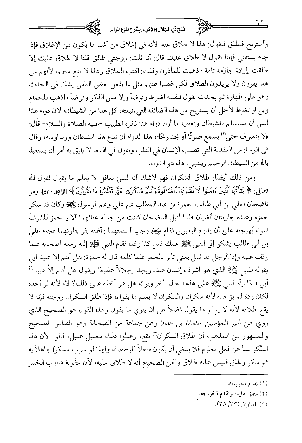 ومن ذلك أيضًا: طلاق السكران فهو لاشك أنه ليس بعاقل لا يعلم ما يقول لقول الله تعالى: {يا أيها الذين امنوا لا تقربوا الصلاة وأنتم سكاري حتى تعلموا ما تقولون} [النساء: 43]. ومر ناضحان لعلي بن أبي طالب بحمزة بن عبد المطلب عم علي وعم الرسول صلى الله عليه وسلم وكان قد سكر حمزة وعنده جاريتان تغنيان فلما أقبل الناضحان كانت من جملة غنائهما ألا يا حمز للشرف النواء يهيجنه على أن يذبح البعيرين فقام رضى الله عنه وجب أسنمتهما وأطنه بقر بطونهما فجاء علي بن أبي طالب يشكو إلى النبي صلى الله عليه وسلم عمك فعل كذا وكذا فقام النبي صلى الله عليه وسلم إليه ومعه أصحابه فلما وقف عليه وإذا الرجل قد ثمل يعني تأثر بالخمر فلما كلمه قال له حمزة: هل أنتم إلا عبيد أبي يقوله للنبي صلى الله عليه وسلم الذي هو أشرف إنسان عنده ويجله إجلالًا عظيمًا ويقول هل أنتم إلا عبيد أبي فلما رآه النبي صلى الله عليه وسلم على هذه الحال تأخر وتركه هل هو آخذه على ذلك؟ لا؛ لأنه لو أخذه لكان ردة لم يؤاخذه لأنه سكران والسكران لا يعلم ما يقول، فإذا طلق السكران زوجته فإنه لا يقع طلاقه لأنه لا يعلم ما يقول فضلًا عن أن ينوي ما يقول وهذا القول هو الصحيح الذي روي عن أمير المؤمنين عثمان بن عفان وعن جماعة من الصحابة وهو القياس الصحيح والمشهور من المذهب أن طلاق السكران يقع، وعللوا ذلك بتعليل عليل، قالوا: لأن هذا السكر نشأ عن فعل محرم فلا ينبغي أن يكون محلًا للرخصة، ولهذا لو شرب سكرًا جاهلًا به ثم سكر وطلق فليس عليه طلاق ولكن الصحيح أنه لا طلاق عليه؛ لأن عقوبة شارب الخمر