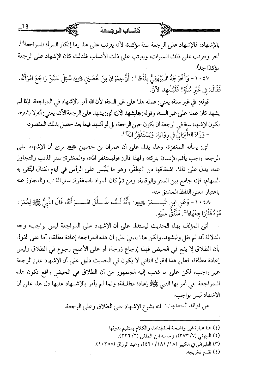 1047 - وأخرجه البيهقيُّ بلفظ. أنَّ عمران بن حصينٍ رضي الله عنه سئل عمَّن راجع امرأته، فقال: في غير سنَّةٍ؟ فليشهد الآن.