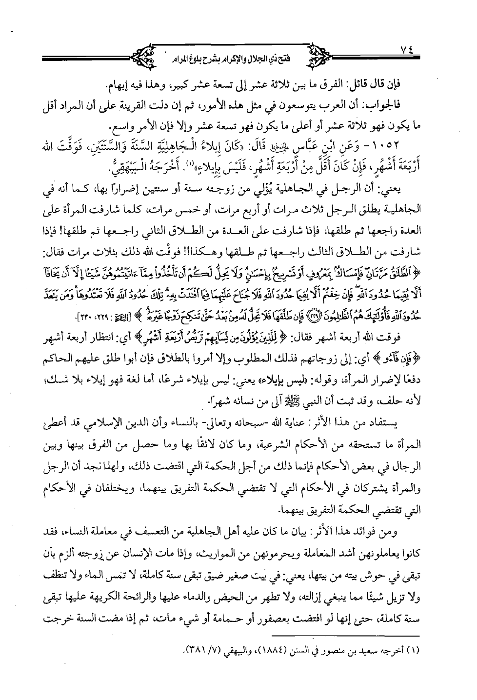 1052 - وعن ابن عبَّاس رضي الله عنهما قال: "كان إيلاء الجاهليَّة السَّنة والسَّنتين، فوقَّت الله أربعة أشهرٍ، فإن كان أقلَّ من أربعة أشهرٍ، فليس بإيلاءٍ". أخرجه البيهقيُّ.