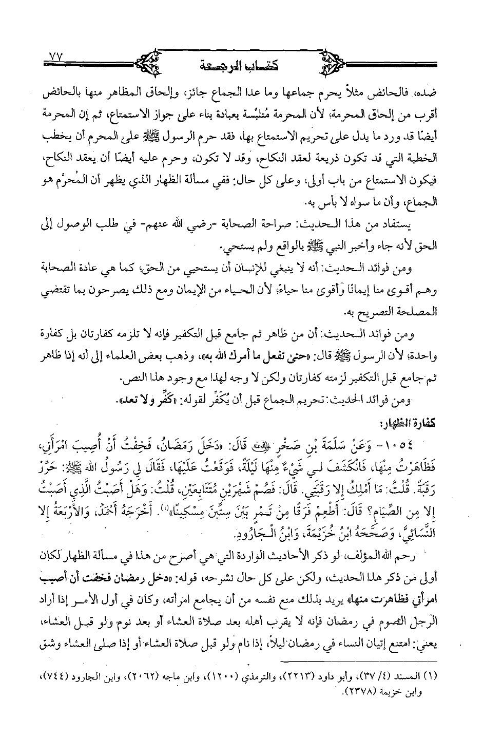 1054 - وعن سلمة بن صخرٍ رضي الله عنه قال: "دخل رمضان، فخفت أن أصيب امرأتي، فظاهرت منها، فانكشف لي شيء منها ليلةً، فوقعت عليها، فقال لي رسول الله صلى الله عليه وسلم: حرِّر رقبةً. قلت: ما أملك إلا رقبتي. قال: فصم شهرين متتابعين، قلت: وهل أصبت الَّذي أصبت إلا من الصِّيام؟ قال: أطعم فرقًا من تمرٍ بين ستِّين مسكينًا". أخرجه أحمد، والأربعة إلا النَّسائيَّ، وصحَّحه ابن خزيمة، وابن الجارود.
