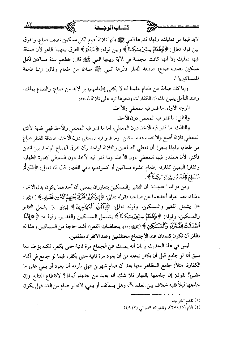 والثالث: ما قدر فيه الآخذ دون المعطي، أما ما قدر فيه المعطي والآخذ فهي فدية الأذى المعطي ثلاثة آصع والآخذ ستة مساكين، وما قدر فيه المعطى دون الآخذ، صدقة الفطر صاع من طعام، ولهذا يجوز أن تعطي الصاعين والثلاثة لواحد وأن تفر الصاع الواحد بين اثنين فأكثر؛ لأن المقدر فيها المعطي دون الآخذ، وما قدر فيه الآخذ دون المعطي كفارة الظهار، وكفارة اليمين كفارته إطعام عشرة مساكين أو كسوتهم، وفي الظهار قال الله تعالى: {فمن لَّم يستطع فإطعام ستين مسكينًا}.