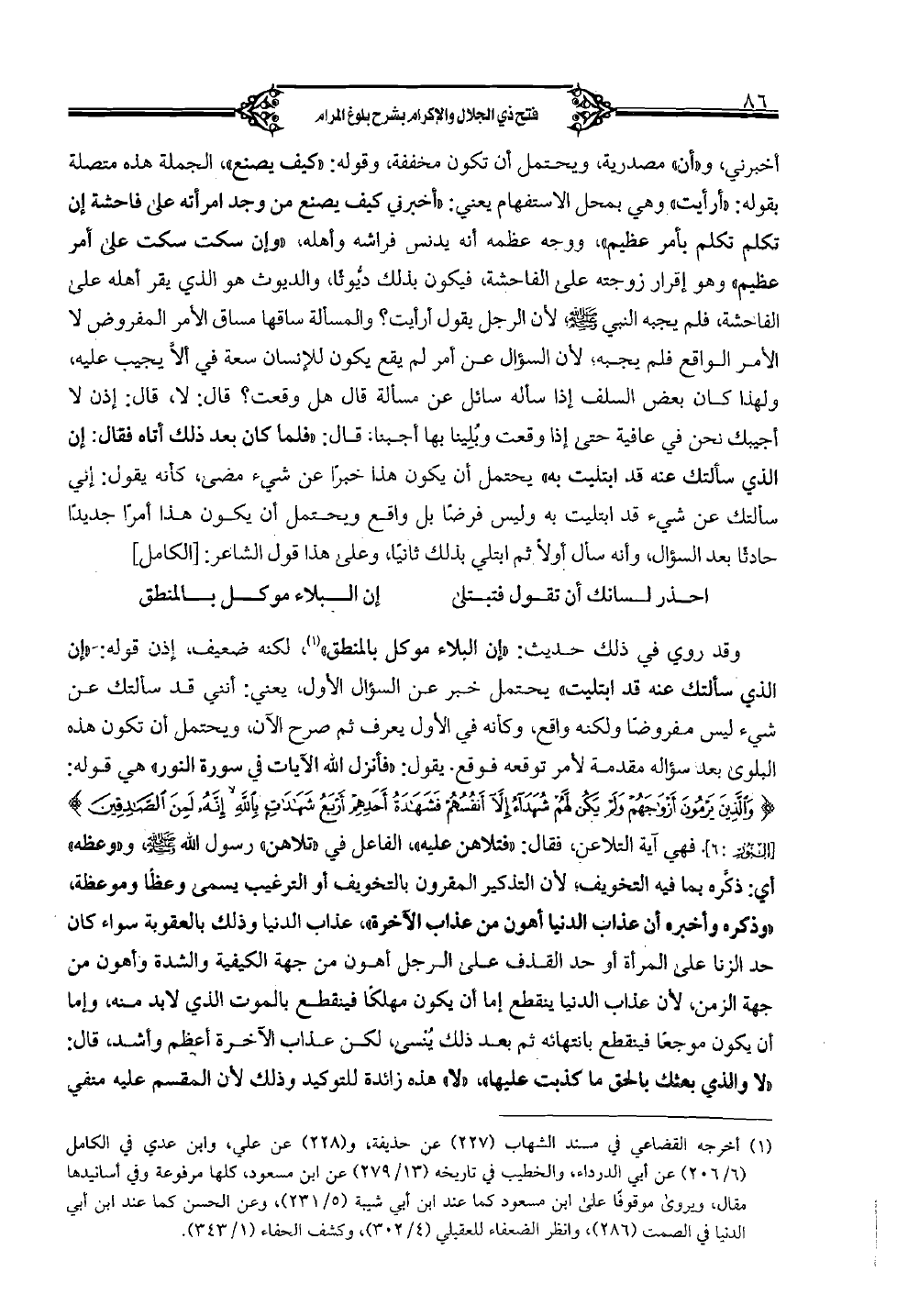 وقد روي في ذلك حديث: "إن البلاء موكل بالمنطق"، لكنه ضعيف، إذن قوله: "إن الذي سألتك عنه قد ابتليت" يحتمل خبر عن السؤال الأول، يعني: أنني قد سألتك عن شيء ليس مفروضًا ولكنه واقع، وكأنه في الأول يعرف ثم صرح الآن، ويحتمل أن تكون هذه البلوى بعد سؤاله مقدمة لأمر توقعه فوقع. يقول: "فأنزل الله الآيات في سورة النور" هي قوله: {والَّذين يرمون أزواجهم ولم يكن لَّهم شهداء إلَّا أنفسهم فشهادة أحدهم أربع شهادات بالله إنَّه لمن الصَّادقين} [النور: 6]. فهي آية التلاعن، فقال: "قتلاهن عليه"، الفاعل في "تلاهن" رسول الله صلى الله عليه وسلم، و"وعظه" أي: ذكَّره بما فيه التخويف؛ لأن التذكير المقرون بالتخويف أو الترغيب يسمى وعظًا وموعظة، "وذكره وأخبره أن عذاب الدنيا أهون من عذاب الآخرة"، عذاب الدنيا وذلك بالعقوبة سواء كان حد الزنا على المرأة أو حد القذف على الرجل أهون من جهة الكيفية والشدة وأهون من جهة الزمن، لأن عذاب الدنيا ينقطع إما أن يكون مهلكًا فينقطع بالموت الذي لا بد منه، وإما أن يكون موجعًا فينقطع بانتهائه ثم بعد ذلك ينسى، لكن عذاب الآخرة أعظم وأشد، قال: "لا والذي بعثك بالحق ما كذبت عليها"، "لا" هذه زائدة للتوكيد وذلك لأن المقسم عليه منفي