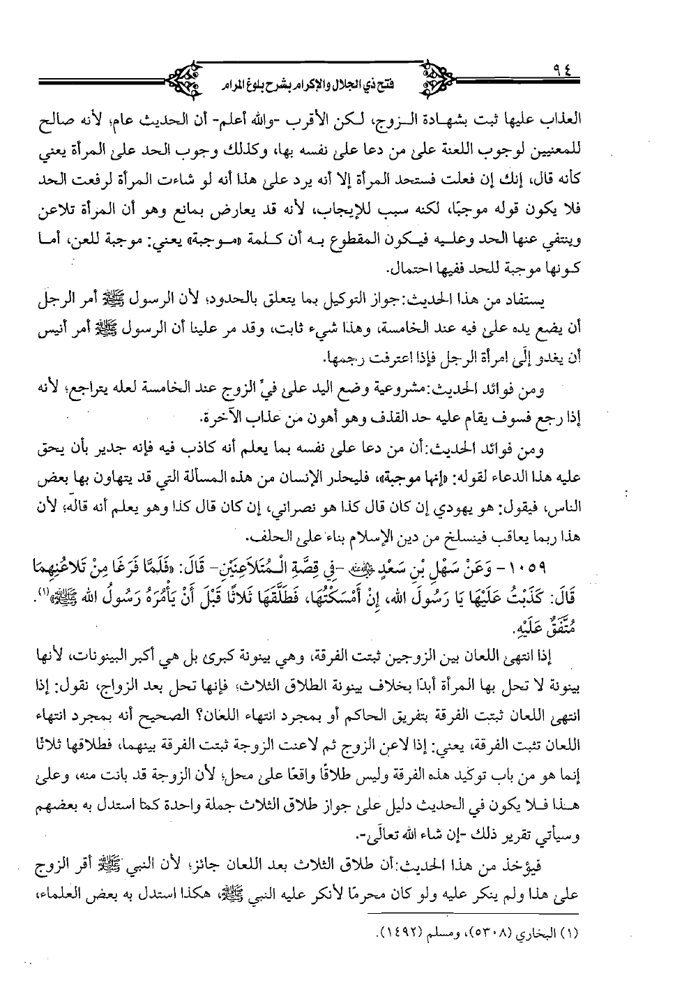 العذاب عليها ثبت بشهادة الزوج، لكن الأقرب- والله أعلم- أن الحديث عام، لأنه صالح للمعنيين لوجوب اللعنة على من دعا على نفسه بها، وكذلك وجوب الحد على المرأة يعني كأنه قال، إنك إن فعلت فستحد المرأة إلا أنه يرد على هذا يعارض هذا أنه لو شاءت المرأة لرفعت الحد فلا يكون قوله موجبًا، لكنه سبب للإيجاب، لأنه قد يعارض بمانع وهو أن المرأة تلاعن وينتفي عنها الحد وعليه فيكون المقطوع به أن كلمة "موجبة" يعني: موجبة للعن، أما كونها موجبة للحد ففيها احتمال.