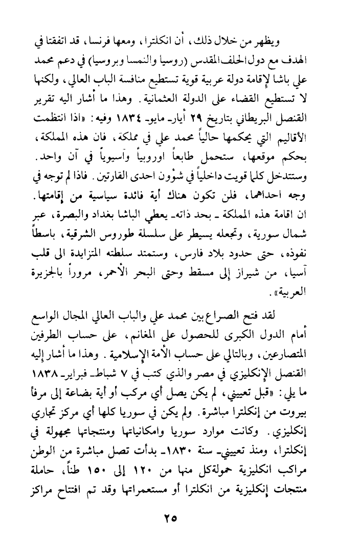 ويظهر من خلال ذلك، أن إنكلترا، ومعها فرنسا، قد اتفقتا في الهدف مع دول الحلف المقدس (روسيا والنمسا وبروسيا) في دعم محمد علي باشا لإقامة دولة عربية قوية تستطيع منافسة الباب العالي، ولكنها لا تستطيع القضاء على الدولة العثمانية. وهذا ما أشار إليه تقرير القنصل البريطاني بتاريخ 29 أيار - مايو - 1834 وفيه: (إذا انتظمت الأقاليم التي يحكمها حاليا محمد علي في مملكة، فإن هذه المملكة، بحكم موقعها، ستحمل طابعا أوروبيا وآسيويا في آن واحد. وستتدخل كلما قويت داخليا في شؤون إحدى القارتين. فإذا لم توجه في وجه إحداهما، فلن تكون هناك أية فائدة سياسية من إقامتها. أن إقامة هذه المملكة - بحد ذاته - يعطي الباشا بغداد والبصرة، عبر شمال سورية، وتجعله يسيطر على سلسلة طوروس الشرقية، باسطا نفوذه، حتى حدود بلاد فارس، وستمتد سلطته المتزايدة إلى قلب آسيا، من شراز إلى مسقط وحتى البحر الأحمر، مرورا بالجزيرة