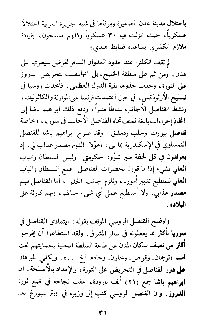 وأوضح القصنل الروسي الموقف بقوله: (يتمادى القناصل في سوريا بأكثر مما يفعلونه في سائر المشرق. ولقد استطاعوا أن يخرجوا أكثر من نصف سكان المدن عن طاعة السلطة المحلية بحمايتهم تحت اسم (ترجمان - وقواص - وخازن - وخادم الخ ...). ويكفي للبرهان على دور القناصل في التحريض على الثورة، والإمداد بالأسلحة، إن إبراهيم باشا جمع (21) ألف بارودة، عقب نجاحه في قمع ثورة الدروز. وأن القنصل الروسي كتب إلى وزيره في بيترسبورغ بعد