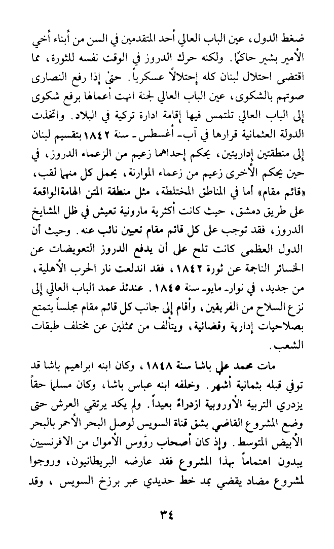 ضغط الدول، عين الباب العالي أحد المتقدمين في السن من أبناء أخي الأمير بشير حاكما. ولكنه حرك الدروز في الوقت نفسه للثورة، مما اقتضى احتلال لبنان كله إحتلالا عسكريا. حتى إذا رفع النصارى صوتهم بالشكوى، عين الباب العالي لجنة أنهت أعمالها برفع شكوى إلى الباب العالي تلتمس فيها إقامة إدارة تركية في البلاد. واتخذت الدولة العثمانية قرارها في آب - أغسطس - سنة 1842 بتقسيم لبنان إلى منطقتين إداريتين، يحكم إحداهما زعيم من الزعماء الدروز، في حين يحكم الأخرى زعيم من زعماء الموارنة، يحمل كل منهما لقب، (قائم مقام) أما في المناطق المختلطة، مثل منطقة المتن الهامة الواقعة على طريق دمشق، حيث كانت أكثرية مارونية تعيش في ظل المشايخ الدروز، فقد توجب على كل قائم مقام تعيين نائب عنه. وحيث أن الدول العظمى كانت تلح على أن يدفع الدروز التعويضات عن الخسائر الناجمة عن ثورة 1842، فقد اندلعت نار الحرب الأهلية، من جديد، في نوار - مايو - سنة 1840. عندئذ عمد الباب العالي إلى نزع السلاح من الفريقين، وأقام إلى جانب كل قائم مقام مجلسا يتمتع بصلاحيات إدارية وقضائية، ويتألف من ممثلين عن مختلف طبقات الشعب.
