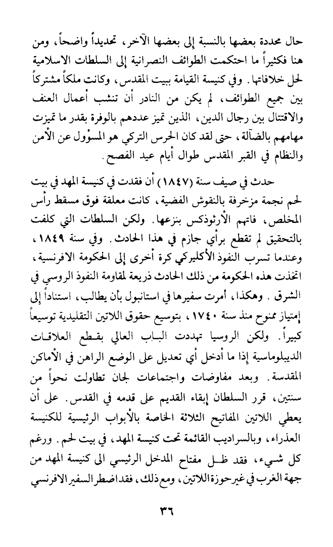 حال محددة بعضها بالنسبة إلى بعضها الآخر، تحديدا واضحا، ومن هنا فكثيرا ما احتكمت الطوائف النصرانية إلى السلطات الإسلامية لحل خلافاتها. وفي كنيسة القيامة ببيت المقدس، وكانت ملكا مشتركا بين جميع الطوائف، لم يكن من النادر أن تنشب أعمال العنف والاقتتال بين رجال الدين، الذين تميز عددهم بالوفرة بقدر ما تميزت مهامهم بالضآلة، حتى لقد كان الحرس التركي هو المسؤول عن الأمن والنظام في القبر المقدس طوال أيام عيد الفصح.