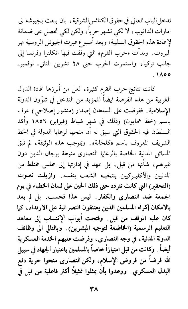 تدخل الباب العالي في حقوق الكنائس الشرقية، بأن يبعث بجيوشه إلى إمارات الدانوب، لا لكي تشهر حربا، ولكن لكي تحصل على ضمانة لإعادة هذه الحقوق السليبة) وبعد أسبوع عبرت الجيوش الروسية نهر البروات. وبدأت (حرب القرم) التي وقفت فيها إنكلترا وفرنسا إلى جانب تركيا، واستمرت الحروب حتى 28 تشرين الثاني - نوفمبر - 1855.
