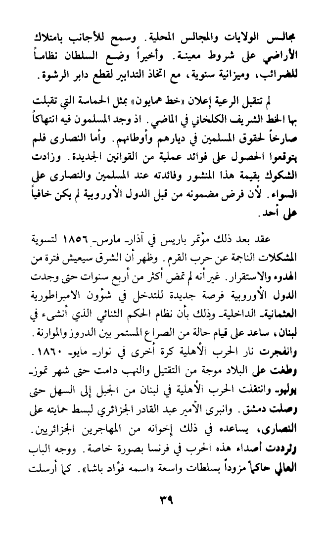 عقد بعد ذلك موتمر باريس في آذار - مارس - 1856 لتسوية المشكلات الناجمة عن حرب القرم. وظهر أن الشرق سيعيش فترة من الهدوء والاستقرار. غير أنه لم تمض أكثر من أربع سنوات حتى وجدت الدول الأوروبية فرصة جديدة للتدخل في شؤون الإمبراطورية العثمانية - الداخلية - وذلك بأن نظام الحكم الثنائي الذي أنشىء في لبنان، ساعد على قيام حالة من الصراع المستمر بين الدروز والموارنة. وانفجرت نار الحرب الأهلية كرة أخرى في نوار - مايو - 1860. وطغت على البلاد موجة من التقتيل والنهب دامت حتى شهر تموز - يوليو - وانتقلت الحرب الأهلية في لبنان من الجبل إلى السهل حتى وصلت دمشق. وانبرى الأمير عبد القادر الجزائري لبسط حمايته على النصارى، يساعده في ذلك إخوانه من المهاجرين الجزائريين. وترددت أصداء هذه الحرب في فرنسا بصورة خاصة. ووجه الباب العالي حاكما مزودا بسلطات واسعة (اسمه فؤاد باشا). كما أرسلت
