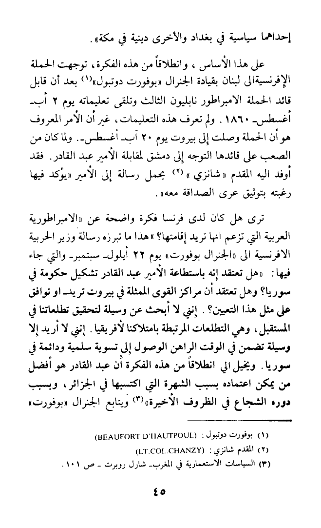 ترى هل كان لدى فرنسا فكرة واضحة عن (الإمبراطورية العربية التي تزعم أنها تريد إقامتها؟) هذا ما تبرزه رسالة وزير الحربية الإفرنسية إلى (الجنرال بوفورت) بوم 22 أيلول - سبتمبر - والتي جاء فيها: (هل تعتقد إنه باستطاعة الأمير عبد القادر تشكيل حكومة في سوريا؟ وهل تعتقد أن مراكز القوى الممثلة في بيروت تريد - أو توافق على مثل هذا التعيين؟. إنني لا أبحث عن وسيلة لتحقيق تطلعاتنا في المستقبل، وهي التطلعات المرتبطة بامتلاكنا لأفريقيا. إنني لا أريد إلا وسيلة تضمن في الوقت الراهن الوصول إلى تسوية سلمية ودائمة في سوريا. ويخيل إلي انطلاقا من هذه الفكرة أن عبد القادر هو أفضل من يمكن اعتماده بسبب الشهرة التي اكتسبها في الجزائر، وبسبب دوره الشجاع في الظروف الأخيرة) (¬3) ويتابع الجنرال (بوفورت)