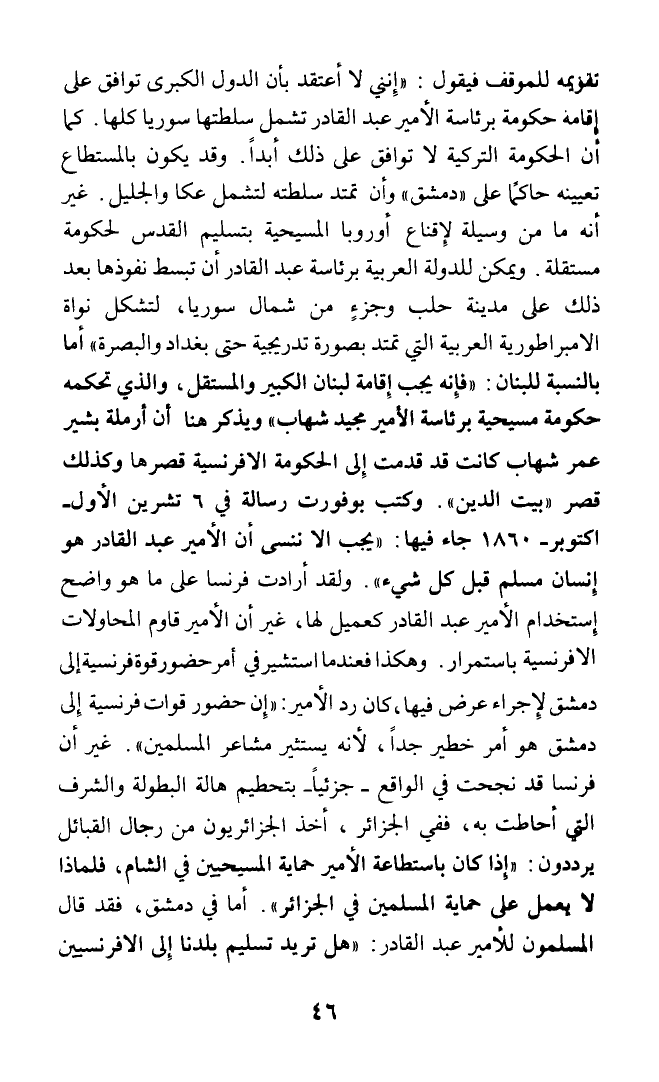 تقويمه للموقف فيقول: (إني لا أعتقد بأن الدول الكبرى توافق عل إقامة حكومة برئاسة الأمير عبد القادر تشمل سلطتها سوريا كلها. كما أن الحكومة التركية لا توافق على ذلك أبدا. وقد يكون بالمستطاع تعيينه حاكما على (دمشق) وأن تمتد سلطته لتشمل عكا والجليل. غير أنه ما من وسيلة لإقناع أوروبا المسيحية بتسليم القدس لحكومة مستقلة. ويمكن للدولة العربية برئاسة عبد القادر أن تبسط نفوذها بعد ذلك على مدينة حلب وجزء من شمال سوريا، لتشكل نواة الإمبراطورية العربية التي تمتد بصورة تدريجية حتى بغداد والبصرة) أما بالنسبة للبنان: (فإنه يجب إقامة لبنان الكبير والمستقل، والذي تحكمه حكومة مسيحية برئاسة الأمير مجيد شهاب) ويذكر هنا أن أرملة بشير عمر شهاب كانت قد قدمت إلى الحكومة الإفرنسية قصرها وكذلك قصر (بيت الدين). وكتب بوفورت رساله في 6 تشرين الأول - أكتوبر - 1860 جاء فيها: (يجب ألا ننسى أن الأمير عبد القادر هو إنسان مسلم قبل كل شيء). ولقد أرادت فرنسا على ما هو واضح إسخدام الأمير عبد القادر كعميل لها، غير أن الأمير قاوم المحاولات الإفرنسية باستمرار. وهكذا فعندما استشير في أمر حضور قوة فرنسية إلى دمشق لإجراء عرض فيها، كان رد الأمير: (إن حضور قوات فرنسية إلى دمشق هو أمر خطير جدا، لأنه يستثير مشاعر المسلمين). غير أن فرنسا قد نجحت في الواقع - جزبيا - بتحطيم هالة البطولة والشرف التي أحاطت به، ففي الجزائر، أخذ الجزائريون من رجال القبائل يرددون: (إذا كان باستطاعة الأمير حماية المسيحيين في الشام، فلماذا لا يعمل على حماية الملمين في الجزائر). أما في دمشق، فقد قال المسلمون للأمير عبد القادر: (هل تريد تسليم بلدنا إلى الإفرنسيين
