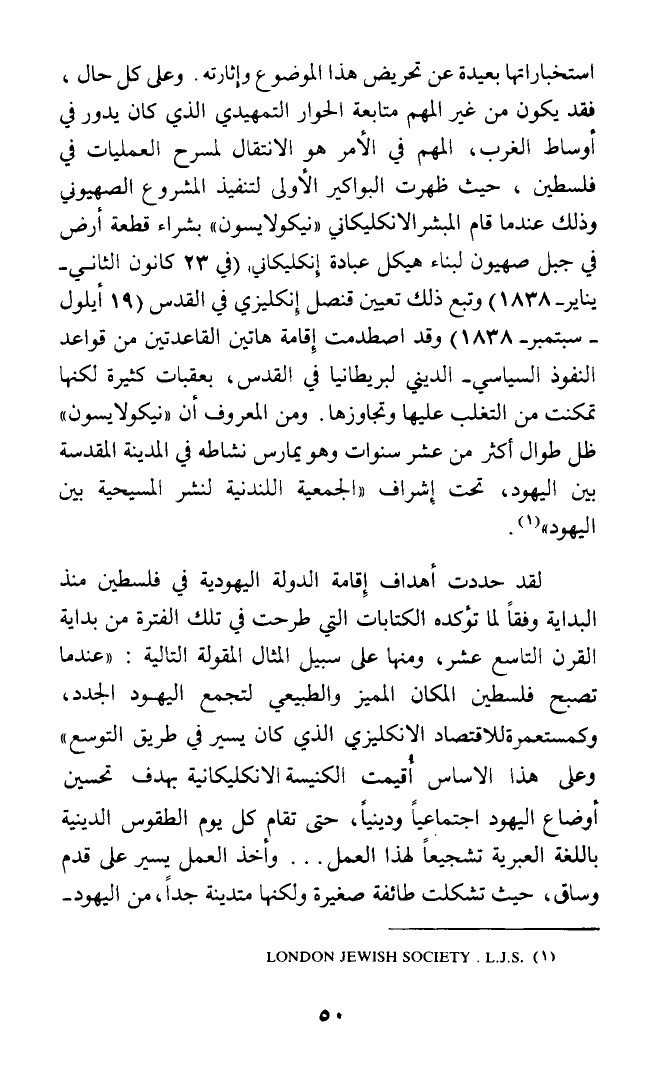 استخباراتها بعيدة عن تحريض هذا الموضوع وإثارته. وعلى كل حال، فقد يكون من غير المهم متابعة الحوار التمهيدي الذي كان يدور في أوساط الغرب، المهم في الأمر هو الانتقال لمسرح العمليات في فلسطين، حيث ظهرت البواكير الأولى لتنفيذ المشروع الصهيوني وذلك عندما قام المبشر الإنكليكاني (نيكولايسون) بشراء قطعة أرض في جبل صهيون لبناء هيكل عبادة إنكليكاني. (في 23 كانون الثاني - يناير - 1838) وتبع ذلك تعيين قنصل إنكليزي في القدس (19 أيلول - سبتمبر - 1838) وقد اصطدمت إقامة هاتين القاعدتين من قواعد النفوذ السياسي - الديني لبريطانيا في القدس، بعقبات كثيرة لكنها تمكنت من التغلب عليها وتجاوزها. ومن المعروف أن (نيكولاسون) ظل طوال أكثر من عشر سنوات وهو يمارس نشاطه في المدينة المقدمة بين اليهود، تحت إشراف (الجمعية اللندنية لنشر المسيحية بين اليهود) (¬1).