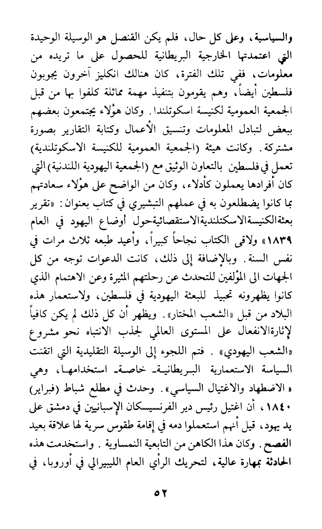 والسياسية، وعلى كل حال، فلم يكن القنصل هو الوسيلة الوحيدة التي اعتمدتها الخارجية البريطانية للحصول على ما تريده من معلومات، ففي تلك الفترة، كان هنالك إنكليز آخرون يجوبون فلسطين أيضا، وهم يقومون بتنفيذ مهمة مماثلة كلفوا بها من قبل الجمعية العمومية لكنيسة اسكوتلندا ; وكان هؤلاء يجتمعون بعضهم ببعض لتبادل المعلومات وتنسيق الأعمال وكتابة التقارير بصورة مشتركة. وكانت هيئة (الجمعية العمومية للكنيسة الإسكوتلندية) تعمل في فلسطين بالتعاون الوثيق مع (الجمعية اليهودية اللندنية) التي كان أفرادها يعملون كأدلاء، وكان من الواضح على هؤلاء سعادتهم بما كانوا يضطلعون به في عملهم التبشيري في كتاب بعنوان: (تقرير بعثة الكنيسة الإسكتلندية الاستقصائية حول أوضاع اليهود في العام 1839) ولاقى الكتاب نجاحا كبيرا، وأعيد طبعه ثلاث مرات في نفس السنة. وبالإضافة إلى ذلك، كانت الدعوات توجه من كل الجهات إلى المؤلفين للتحدث عن رحلتهم المثيرة وعن الاهتمام الذي كانوا يظهرونه تحبيذ للبعثة اليهودية في فلسطين، ولاستعمار هذه البلاد من قبل (الشعب المختار). ويظهر أن كل ذلك لم يكن كافيا لإثارة الانفعال على المستوى العالمي لجذب الانتباه نحو مشروع (الشعب اليهودي). فتم اللجوء إلى الوسيلة التقليدية التي أتقنت السياسة الاستعمارية البريطانية - خاصة - استخدامها، وهي (الاضطهاد والاغتيال السياسي). وحدث في مطلع شباط (فبراير) 1840، أن اغتيل رئيس دير الفرنسيسكان الإسبانيين في دمشق على يد يهود، قيل أنهم استعملوا دمه في إقامة طقوس سرية لها علاقة بعيد الفصح. وكان هذا الكاهن من التابعية النمساوية واستخدمت هذه الحادثة بمهارة عالية، لتحريك الرأي العام الليبيرالي في أوروبا، في
