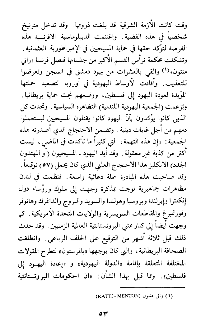 وقت كانت الأزمة الشرقية قد بلغت ذروتها. وقد تدخل مترنيخ شخصيا في هذه القضية. واغتنمت الديبلوماسية الإفرنسية هذه الفرصة لتؤكد حقها في حماية المسيحيين في الإمبراطورية العثمانية. وتشكلت محكمة ترأس القسم الأكبر من جلساتها قنصل فرنسا (راتي منتون) (¬1) وألقي بالعشرات من يهود دمشق في السجن وتعرضوا للتعذيب. وأفادت الأوساط اليهودية في أوروبا لتصعيد حملتها المزيدة لعودة اليهود إلى فلسطين، ووضعهم تحت حماية بريطانيا. وتزعمت (الجمعية اليهودية اللندنية) التظاهرة السياسية. وتحدت كل الذين كانوا يؤكدون بأن اليهود كانوا يقتلون المسيحيين ليستعملوا دمهم من أجل غايات دينية. وتضمن الاحتجاج الذي أصدرته هذه الجمعية: (إن هذه التهمة، التي كثيرا ما تأكدت في الماضي، ليست أكثر من كذبة غير معقولة. وقد أيد اليهود - المسيحيون (أو المهتدون الجدد) الإنكليز هذا الاحتجاج العلني الذي كان يحمل (57) توقيعا. وقد صاحبت هذه المبادرة حملة دعائية واسعة. فنظمت في لندن مظاهرات جماهيرية توجت بمذكرة وجهت إلى ملوك ورؤساء دول
