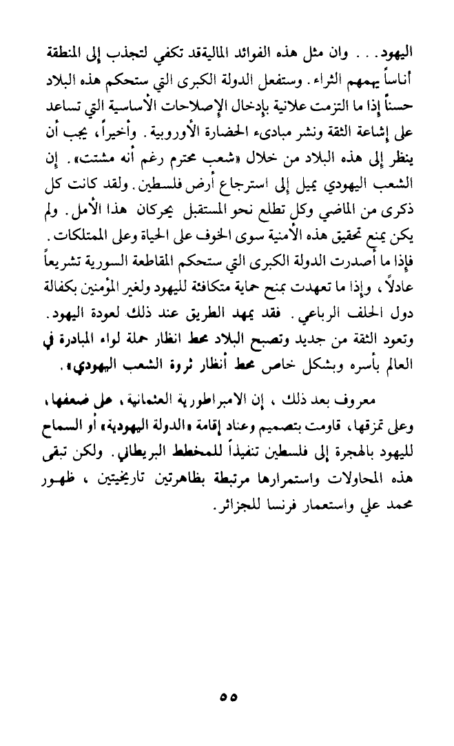 اليهود ... وأن مثل هذه الفوائد المالية قد تكفي لتجذب إلى المنطقة أناسا يهمهم الثراء. وستفعل الدولة الكبرى التي ستحكم هذه البلاد حسنا إذا ما التزمت علانية بإدخال الإصلاحات الأساسية التي تساعد على إشاعة الثقة ونشر مبادىء الحضارة الأوروبية. وأخيرا، يجب أن ينظر إلى هذه البلاد من خلال (شعب محترم رغم أنه مشتت). إن الشعب اليهودي يميل إلى استرجاع أرض فلسطين , ولقد كانت كل ذكرى من الماضي وكل تطلع نحو المستقبل يحركان هذا الأمل. ولم يكن يمنع تحقيق هذه الأمنية سوى الخوف على الحياة وعلى الممتلكات. فإذا ما أصدرت الدولة الكبرى التي ستحكم المقاطعة السورية تشريعا عادلا، وإذا ما تعهدت بمنح حماية متكافئة لليهود ولغير المؤمنين بكفالة دول الحلف الرباعي. فقد يمهد الطريق عند ذلك لعودة اليهود. وتعود الثقة من جديد وتمسح البلاد محط أنظار حملة لواء المبادرة في العالم بأسره وبشكل خاص محط أنظار ثروة الشعب اليهودي).
