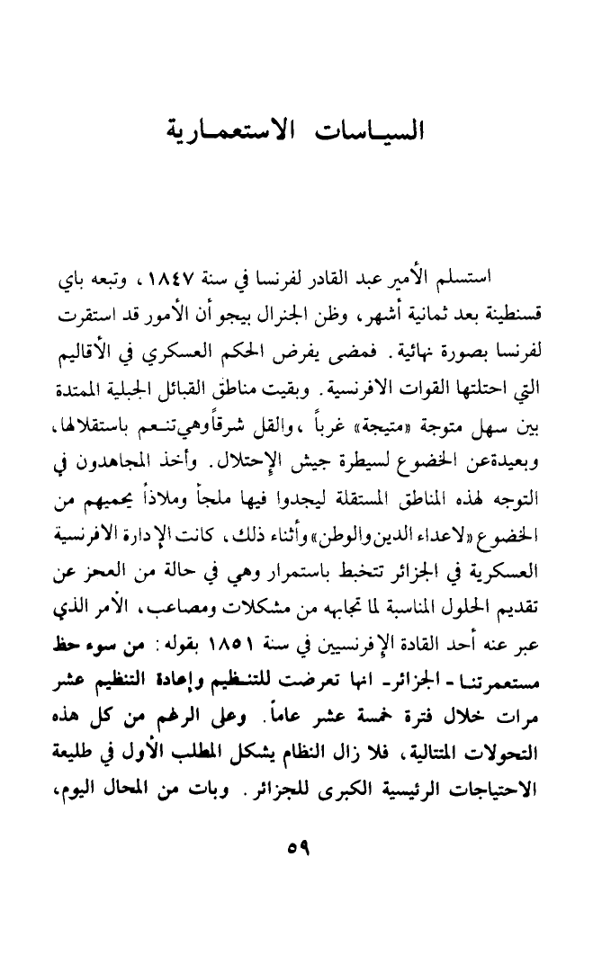 استسلم الأمير عبد القادر لفرنسا في سنة 1847، وتبعه باي قسنطينة بعد ثمانية أشهر، وظن الجنرال بيجو أن الأمور قد استقرت لفرنسا بصورة نهائية. فمضى يفرض الحكم العسكري في الأقاليم التي احتلتها القوات الإفرنسية. وبقيت مناطق القبائل الجبلية الممتدة بين سهل متوجة (متيجة) غربا، والقل شرقا وهي تنعم باستقلالها، وبعيدة عن الخضوع لسيطرة جيش الإحتلال. وأخذ المجاهدون في التوجه لهذه المناطق المستقلة ليجدوا فيها ملجأ وملاذا يحميهم من الخضوع (لأعداء الدين والوطن) أثناء ذلك، كانت الإدارة الإفرنسية العسكرية في الجزائر تتخبط باستمرار وهي في حالة من العحز عن تقديم الحلول المناسبة لما تجابهه من مشكلات ومصاعب، الأمر الذي عبر عنه أحد القادة الإفرنسيين في سنة 1851 بقوله: من سوء حظ مستعمرتنا - الجزائر - أنها تعرضت للتنظيم وإعادا التنظيم عشر مرات خلال فترة خمسة عشر عاما. وعلى الرغم من كل هذه التحولات المتتالية، فلا زال النظام يشكل المطلب الأول في طليعة الاحتياجات الرئيسية الكبرى للجزائر. وبات من المحال اليوم،