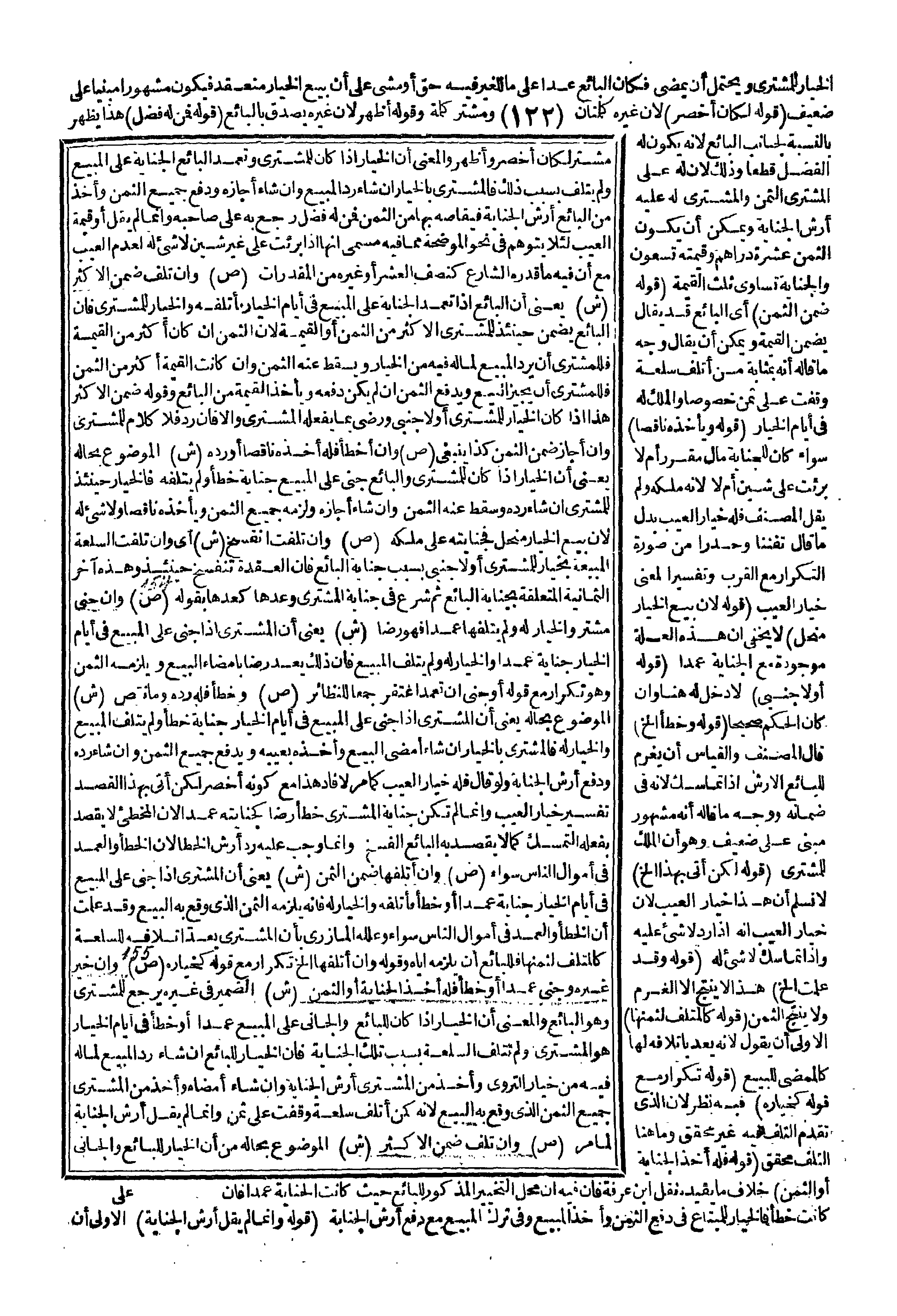 ـــــــــــــــــــــــــــــQالْخِيَارُ لِلْمُشْتَرِي، وَيَحْتَمِلُ أَنْ يَمْضِيَ فَكَأَنَّ الْبَائِعَ عَدَا عَلَى مَا لِلْغَيْرِ فِيهِ حَقٌّ أَوْ مَشَى عَلَى أَنَّ بَيْعَ الْخِيَارِ مُنْعَقِدٌ فَيَكُونُ مَشْهُورًا مَبْنِيًّا عَلَى ضَعِيفٍ (قَوْلُهُ لَكَانَ أَخْصَرَ) لِأَنَّ غَيْرَهُ كَلِمَتَانِ وَمُشْتَرٍ كَلِمَةٌ، وَقَوْلُهُ أَظْهَرُ لِأَنَّ غَيْرَهُ يَصْدُقُ بِالْبَائِعِ (قَوْلُهُ فَمَنْ لَهُ فَضْلٌ) هَذَا يَظْهَرُ بِالنِّسْبَةِ لِجَانِبِ الْبَائِعِ لِأَنَّهُ يَكُونُ لَهُ الْفَضْلُ قَطْعًا، وَذَلِكَ لِأَنَّ لَهُ عَلَى الْمُشْتَرِي الثَّمَنَ، وَالْمُشْتَرِي لَهُ عَلَيْهِ أَرْشُ الْجِنَايَةِ، وَيُمْكِنُ أَنْ يَكُونَ الثَّمَنُ عَشَرَةَ دَرَاهِمَ، وَقِيمَتُهُ تِسْعُونَ وَالْجِنَايَةُ تُسَاوِي ثُلُثَ الْقِيمَةِ (قَوْلُهُ ضَمِنَ الثَّمَنَ) أَيْ الْبَائِعُ قَدْ يُقَالُ يَضْمَنُ الْقِيمَةَ، وَيُمْكِنُ أَنْ يُقَالَ وَجْهُ مَا قَالَهُ أَنَّهُ بِمَثَابَةِ مَنْ أَتْلَفَ سِلْعَةً وُقِفَتْ عَلَى ثَمَنٍ خُصُوصًا، وَالْمِلْكُ لَهُ فِي أَيَّامِ الْخِيَارِ.