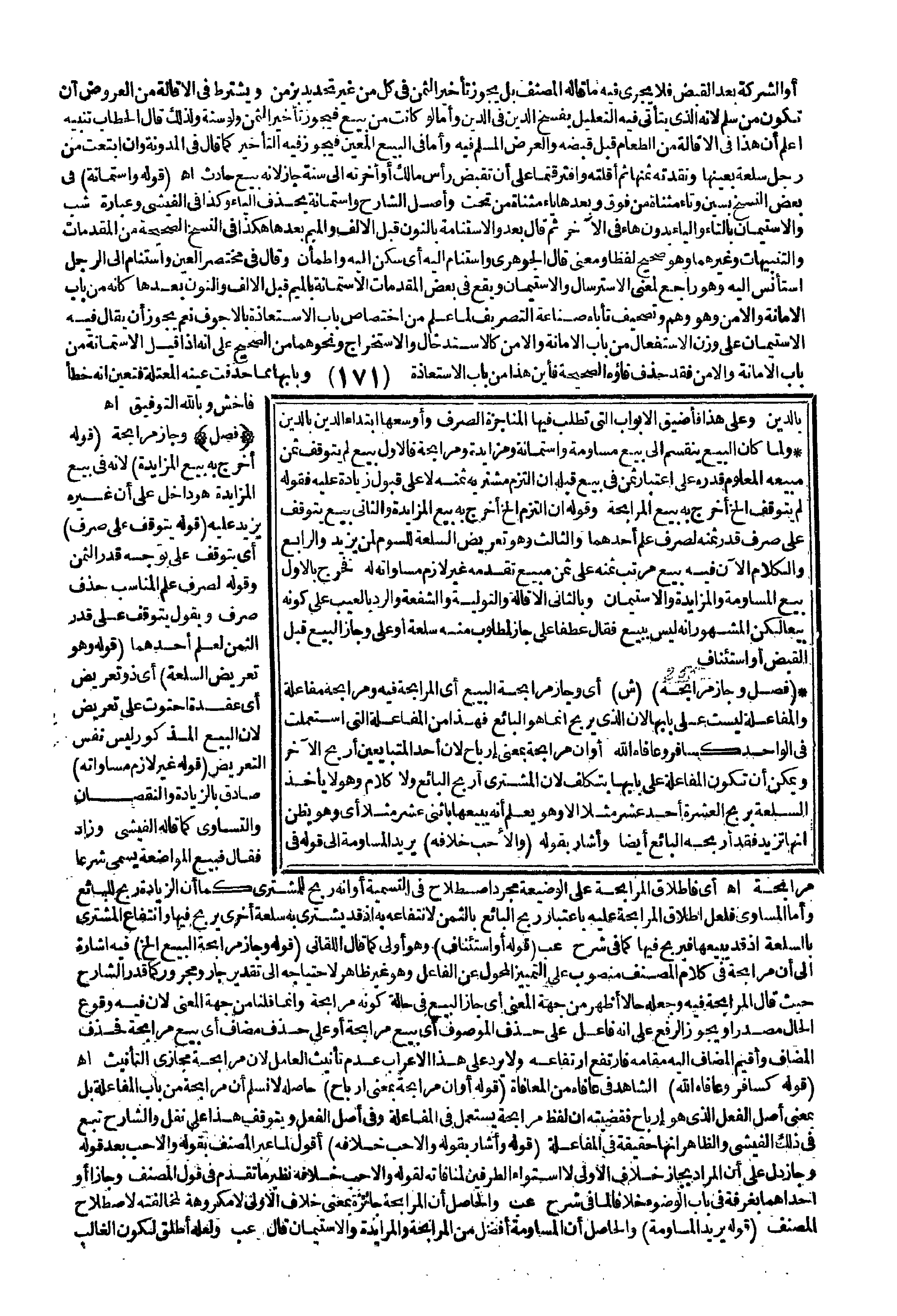 بِالدَّيْنِ، وَعَلَى هَذَا فَأَضْيَقُ الْأَبْوَابِ الَّتِي تُطْلَبُ فِيهَا الْمُنَاجَزَةُ الصَّرْفُ، وَأَوْسَعُهَا ابْتِدَاءُ الدَّيْنِ بِالدَّيْنِ وَلَمَّا كَانَ الْبَيْعُ يَنْقَسِمُ إلَى بَيْعِ مُسَاوَمَةٍ وَاسْتِمَانَةٍ وَمُزَايَدَةٍ وَمُرَابَحَةٍ فَالْأَوَّلُ بَيْعٌ لَمْ يَتَوَقَّفْ ثَمَنُ مَبِيعِهِ الْمَعْلُومِ قَدْرُهُ عَلَى اعْتِبَارِ ثَمَنٍ فِي بَيْعٍ قَبْلَهُ إنْ الْتَزَمَ مُشْتَرِيهِ ثَمَنَهُ لَا عَلَى قَبُولِ زِيَادَةٍ عَلَيْهِ فَقَوْلُهُ لَمْ يَتَوَقَّفْ إلَخْ أَخْرَجَ بِهِ بَيْعَ الْمُرَابَحَةِ، وَقَوْلُهُ إنْ الْتَزَمَ إلَخْ أَخْرَجَ بِهِ بَيْعَ الْمُزَايَدَةِ، وَالثَّانِي بَيْعٌ يَتَوَقَّفُ عَلَى صَرْفِ قَدْرِ ثَمَنِهِ لِصَرْفِ عِلْمِ أَحَدِهِمَا، وَالثَّالِثُ، وَهُوَ تَعْرِيضُ السِّلْعَةِ لِلسَّوْمِ لِمَنْ يَزِيدُ، وَالرَّابِعُ وَالْكَلَامُ الْآنَ فِيهِ بَيْعٌ مُرَتَّبٌ ثَمَنُهُ عَلَى ثَمَنِ مَبِيعٍ تَقَدَّمَهُ غَيْرُ لَازِمٍ مُسَاوَاتُهُ لَهُ فَخَرَجَ بِالْأَوَّلِ بَيْعُ الْمُسَاوَمَةِ وَالْمُزَايَدَةِ وَالِاسْتِيمَانِ، وَبِالثَّانِي الْإِقَالَةُ وَالتَّوْلِيَةُ وَالشُّفْعَةُ، وَالرَّدُّ بِالْعَيْبِ عَلَى كَوْنِهِ بَيْعًا لَكِنْ الْمَشْهُورُ أَنَّهُ لَيْسَ بِبَيْعٍ فَقَالَ عَطْفًا عَلَى جَازَ لِمَطْلُوبٍ مِنْهُ سِلْعَةٌ، أَوْ عَلَى وَجَازَ الْبَيْعُ قَبْلَ الْقَبْضِ أَوْ اسْتِئْنَافٌ