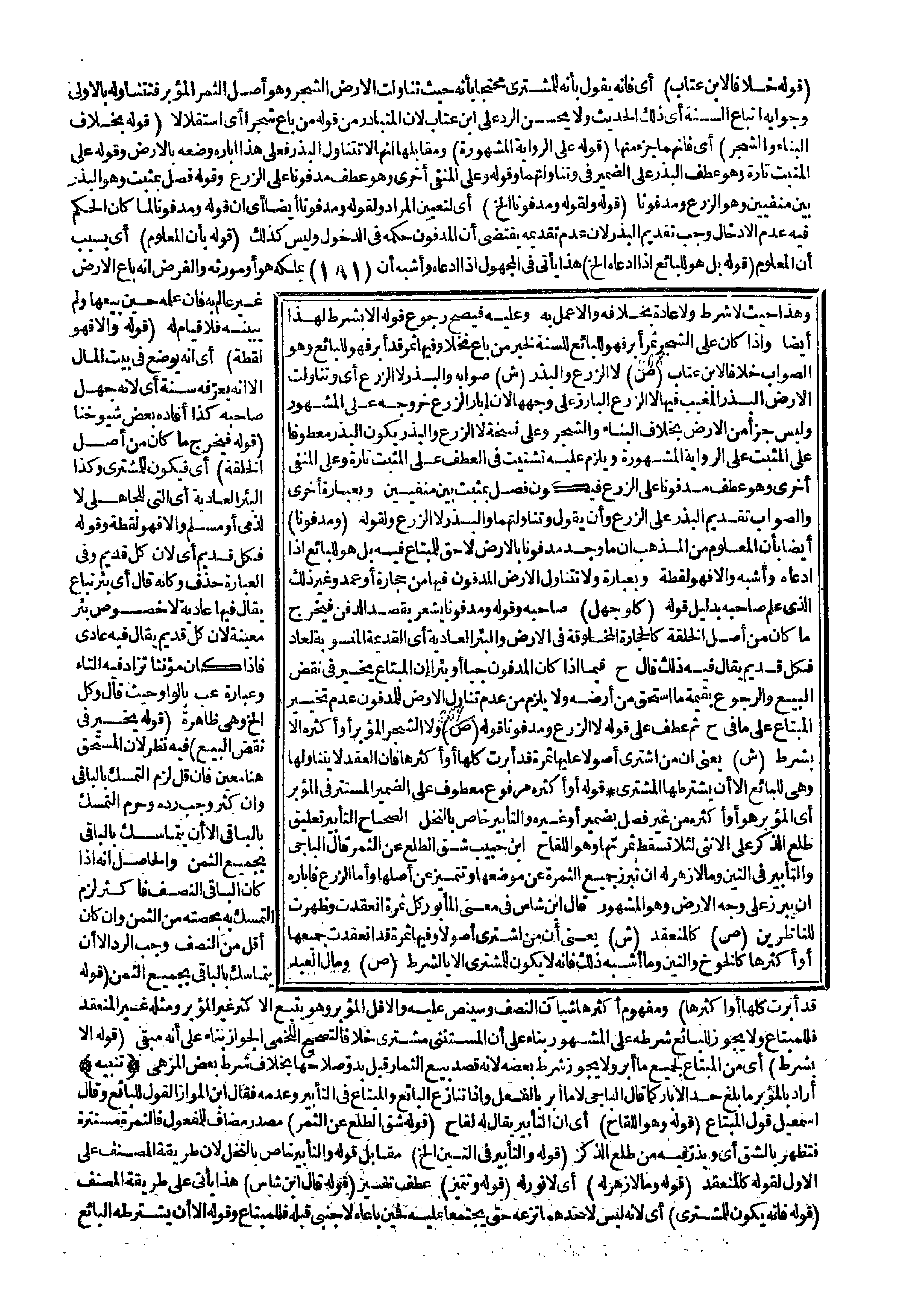 وَهَذَا حَيْثُ لَا شَرْطَ، وَلَا عَادَةَ بِخِلَافِهِ، وَإِلَّا عُمِلَ بِهِ، وَعَلَيْهِ فَيَصِحُّ رُجُوعُ قَوْلِهِ إلَّا بِشَرْطٍ لِهَذَا أَيْضًا، وَإِذَا كَانَ عَلَى الشَّجَرِ ثَمَرٌ أُبِّرَ فَهُوَ لِلْبَائِعِ لِلسُّنَّةِ لِخَبَرِ «مَنْ بَاعَ نَخْلًا، وَفِيهَا ثَمَرٌ قَدْ أُبِّرَ فَهُوَ لِلْبَائِعِ» ، وَهُوَ الصَّوَابُ خِلَافًا لِابْنِ عَتَّابٍ (ص) لَا الزَّرْعُ وَالْبَذْرُ (ش) صَوَابُهُ، وَالْبَذْرُ وَلَا الزَّرْعُ أَيْ وَتَنَاوَلَتْ الْأَرْضُ الْبَذْرَ الْمُغَيَّبَ فِيهَا لَا الزَّرْعَ الْبَارِزَ عَلَى وَجْهِهَا لِأَنَّ إبَارَ الزَّرْعِ خُرُوجُهُ عَلَى الْمَشْهُورِ، وَلَيْسَ جُزْءًا مِنْ الْأَرْضِ بِخِلَافِ الْبِنَاءِ وَالشَّجَرِ، وَعَلَى نُسْخَةِ لَا الزَّرْعَ وَالْبَذْرَ يَكُونُ الْبَذْرُ مَعْطُوفًا عَلَى الْمُثْبَتِ عَلَى الرِّوَايَةِ الْمَشْهُورَةِ، وَيَلْزَمُ عَلَيْهِ تَشْتِيتٌ فِي الْعَطْفِ عَلَى الْمُثْبَتِ تَارَةً، وَعَلَى الْمَنْفِيِّ أُخْرَى، وَهُوَ عَطَفَ مَدْفُونًا عَلَى الزَّرْعِ فَيَكُونُ فَصَلَ بِمُثْبَتٍ بَيْنَ مَنْفِيَّيْنِ، وَبِعِبَارَةٍ أُخْرَى، وَالصَّوَابُ تَقْدِيمُ الْبَذْرِ عَلَى الزَّرْعِ، وَأَنْ يَقُولَ وَتَنَاوَلَتْهُمَا، وَالْبَذْرُ لَا الزَّرْعُ، وَلِقَوْلِهِ (وَمَدْفُونًا) أَيْضًا بِأَنَّ الْمَعْلُومَ مِنْ الْمَذْهَبِ أَنَّ مَا وُجِدَ مَدْفُونًا بِالْأَرْضِ لَا حَقَّ لِلْمُبْتَاعِ فِيهِ بَلْ هُوَ لِلْبَائِعِ إذَا ادَّعَاهُ، وَأَشْبَهَ، وَإِلَّا فَهُوَ لُقَطَةٌ، وَبِعِبَارَةٍ وَلَا تَتَنَاوَلُ الْأَرْضُ الْمَدْفُونَ فِيهَا مِنْ حِجَارَةٍ أَوْ عُمَدٍ وَغَيْرِ ذَلِكَ الَّذِي عَلِمَ صَاحِبُهُ بِدَلِيلِ قَوْلِهِ (كَلَوْ جَهِلَ) صَاحِبُهُ، وَقَوْلُهُ وَمَدْفُونًا يُشْعِرُ بِقَصْدِ الدَّفْنِ فَيَخْرُجُ مَا كَانَ مِنْ أَصْلِ الْخِلْقَةِ كَالْحِجَارَةِ الْمَخْلُوفَةِ فِي الْأَرْضِ وَالْبِئْرِ الْعَادِيَّةِ أَيْ الْقَدِيمَةِ الْمَنْسُوبَةِ لِعَادٍ فَكُلُّ قَدِيمٍ يُقَالُ فِيهِ ذَلِكَ قَالَ ح فِيمَا إذَا كَانَ الْمَدْفُونُ جُبًّا أَوْ بِئْرًا إنَّ الْمُبْتَاعَ يُخَيَّرُ فِي نَقْضِ الْبَيْعِ، وَالرُّجُوعِ بِقِيمَةِ مَا اُسْتُحِقَّ مِنْ أَرْضِهِ، وَلَا يَلْزَمُ مِنْ عَدَمِ تَنَاوُلِ الْأَرْضِ لِلْمَدْفُونِ عَدَمُ تَخْيِيرِ الْمُبْتَاعِ عَلَى مَا فِي ح ثُمَّ عُطِفَ عَلَى قَوْلِهِ لَا الزَّرْعُ، وَمَدْفُونًا