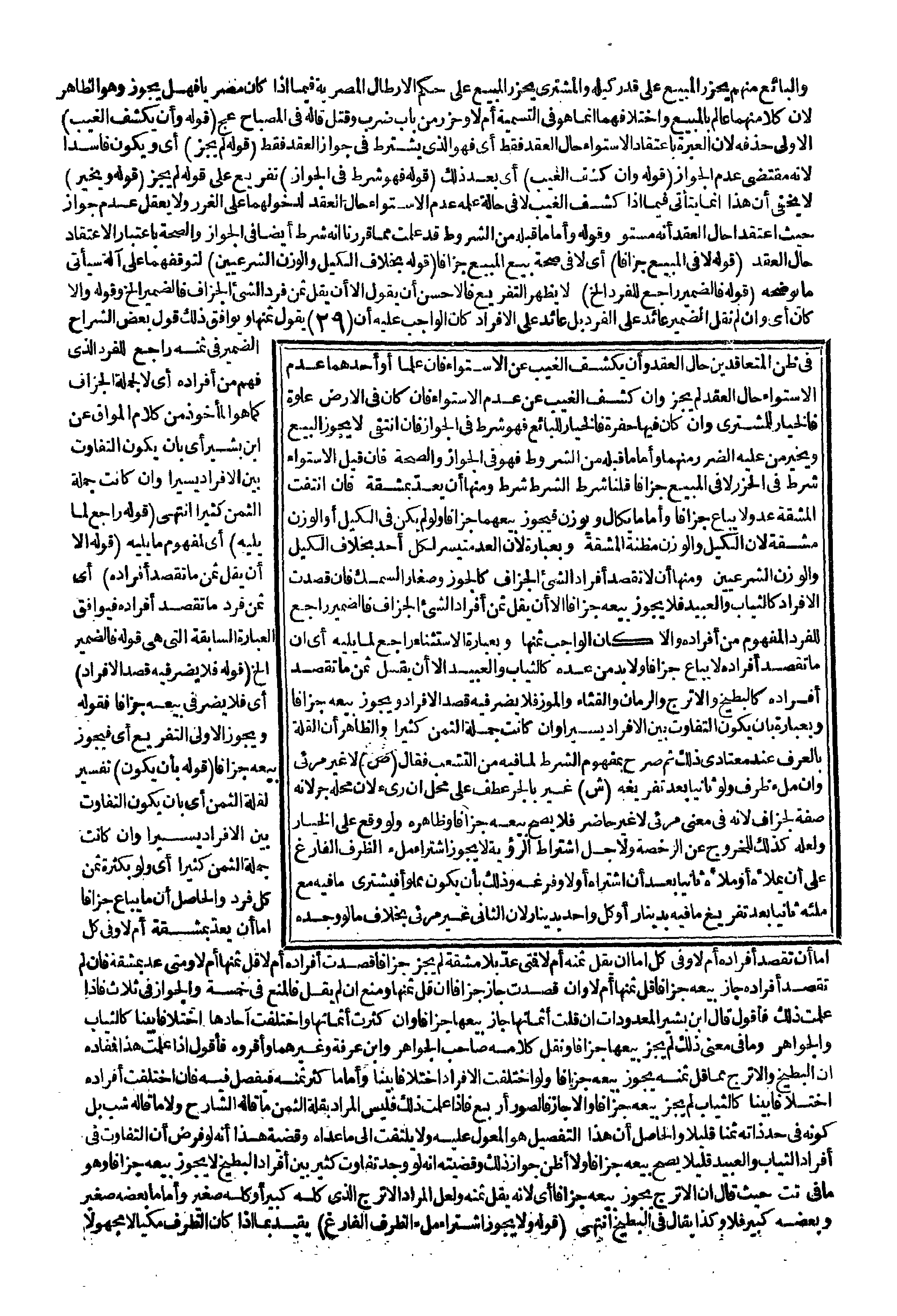 فَإِذَا عَلِمْت ذَلِكَ فَأَقُولُ قَالَ ابْنُ بَشِيرٍ الْمَعْدُودَاتُ إنْ قَلَّتْ أَثْمَانُهَا جَازَ بَيْعُهَا جُزَافًا وَإِنْ كَثُرَتْ أَثْمَانُهَا وَاخْتَلَفَتْ آحَادُهَا اخْتِلَافًا بَيِّنًا كَالثِّيَابِ وَالْجَوَاهِرِ وَمَا فِي مَعْنَى ذَلِكَ لَمْ يَجُزْ بَيْعُهَا جُزَافًا، وَنَقَلَ كَلَامَهُ صَاحِبُ الْجَوَاهِرِ وَابْنُ عَرَفَةَ وَغَيْرُهُمَا وَأَقَرُّوهُ فَأَقُولُ إذَا عَلِمْت هَذَا فَمُفَادُهُ أَنَّ الْبِطِّيخَ وَالْأُتْرُجَّ مِمَّا قَلَّ ثَمَنُهُ يَجُوزُ بَيْعُهُ جُزَافًا، وَلَوْ اخْتَلَفَتْ الْأَفْرَادُ اخْتِلَافًا بَيِّنًا، وَأَمَّا مَا كَثُرَ ثَمَنُهُ فَيُفْصَلُ فِيهِ فَإِنْ اخْتَلَفَتْ أَفْرَادُهُ اخْتِلَافًا بَيِّنًا كَالثِّيَابِ لَمْ يَجُزْ بَيْعُهُ جُزَافًا وَإِلَّا جَازَ فَالصُّوَرُ أَرْبَعٌ فَإِذَا عَلِمْت ذَلِكَ فَلَيْسَ الْمُرَادُ بِقِلَّةِ الثَّمَنِ مَا قَالَهُ الشَّارِحُ وَلَا مَا قَالَهُ شب بَلْ كَوْنُهُ فِي حَدِّ ذَاتِهِ ثَمَنًا قَلِيلًا، وَالْحَاصِلُ أَنَّ هَذَا التَّفْصِيلَ هُوَ الْمُعَوَّلُ عَلَيْهِ وَلَا يُلْتَفَتُ إلَى مَا عَدَاهُ وَقَضِيَّةُ هَذَا أَنَّهُ لَوْ فُرِضَ أَنَّ التَّفَاوُتَ فِي أَفْرَادِ الثِّيَابِ وَالْعَبِيدِ قَلِيلًا يَصِحُّ بَيْعُهُ جُزَافًا وَلَا أَظُنُّ جَوَازَ ذَلِكَ، وَقَضِيَّتُهُ أَنَّهُ لَوْ وُجِدَ تَفَاوُتٌ كَثِيرٌ بَيْنَ أَفْرَادِ الْبِطِّيخِ لَا يَجُوزُ بَيْعُهُ جُزَافًا وَهُوَ مَا فِي تت حَيْثُ قَالَ إنَّ الْأُتْرُجَّ يَجُوزُ بَيْعُهُ جُزَافًا أَيْ؛ لِأَنَّهُ يَقِلُّ ثَمَنُهُ وَلَعَلَّ الْمُرَادَ الْأُتْرُجُّ الَّذِي كُلُّهُ كَبِيرٌ أَوْ كُلُّهُ صَغِيرٌ، وَأَمَّا مَا بَعْضُهُ صَغِيرٌ وَبَعْضُهُ كَبِيرٌ فَلَا وَكَذَا يُقَالُ فِي الْبِطِّيخِ انْتَهَى.