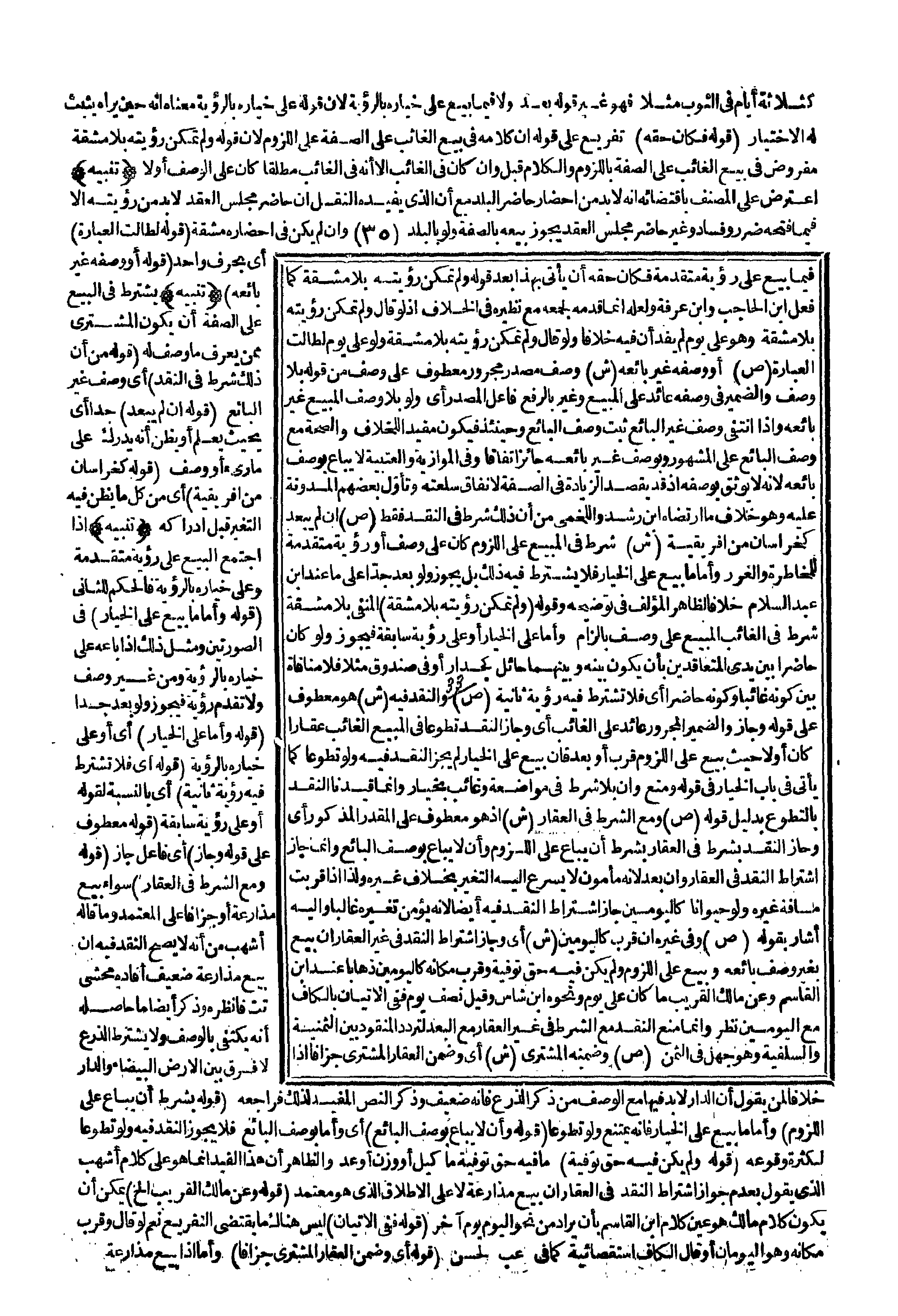 (ص) إنْ لَمْ يَبْعُدْ كَخُرَاسَانَ مِنْ أَفْرِيقِيَّةَ (ش) شَرْطٌ فِي الْمَبِيعِ عَلَى اللُّزُومِ كَانَ عَلَى وَصْفٍ أَوْ رُؤْيَةٍ مُتَقَدِّمَةٍ لِلْمُخَاطَرَةِ وَالْغَرَرِ، وَأَمَّا مَا بِيعَ عَلَى الْخِيَارِ فَلَا يُشْتَرَطُ فِيهِ ذَلِكَ بَلْ يَجُوزُ وَلَوْ بَعُدَ جِدًّا عَلَى مَا عِنْدَ ابْنِ عَبْدِ السَّلَامِ خِلَافًا لِظَاهِرِ الْمُؤَلِّفِ فِي تَوْضِيحِهِ وَقَوْلُهُ (وَلَمْ تُمْكِنْ رُؤْيَتُهُ بِلَا مَشَقَّةٍ) الْمَنْفِيُّ بِلَا مَشَقَّةٍ شَرْطٌ فِي الْغَائِبِ الْمَبِيعِ عَلَى وَصْفٍ بِإِلْزَامٍ، وَأَمَّا عَلَى الْخِيَارِ أَوْ عَلَى رُؤْيَةٍ سَابِقَةٍ فَيَجُوزُ وَلَوْ كَانَ حَاضِرًا بَيْنَ يَدَيْ الْمُتَعَاقِدَيْنِ بِأَنْ يَكُونَ بَيْنَهُ وَبَيْنَهُمَا حَائِلٌ كَجِدَارٍ أَوْ فِي صُنْدُوقٍ مَثَلًا فَلَا مُنَافَاةَ بَيْنَ كَوْنِهِ غَائِبًا وَكَوْنِهِ حَاضِرًا أَيْ فَلَا تُشْتَرَطُ فِيهِ رُؤْيَةٌ ثَانِيَةٌ