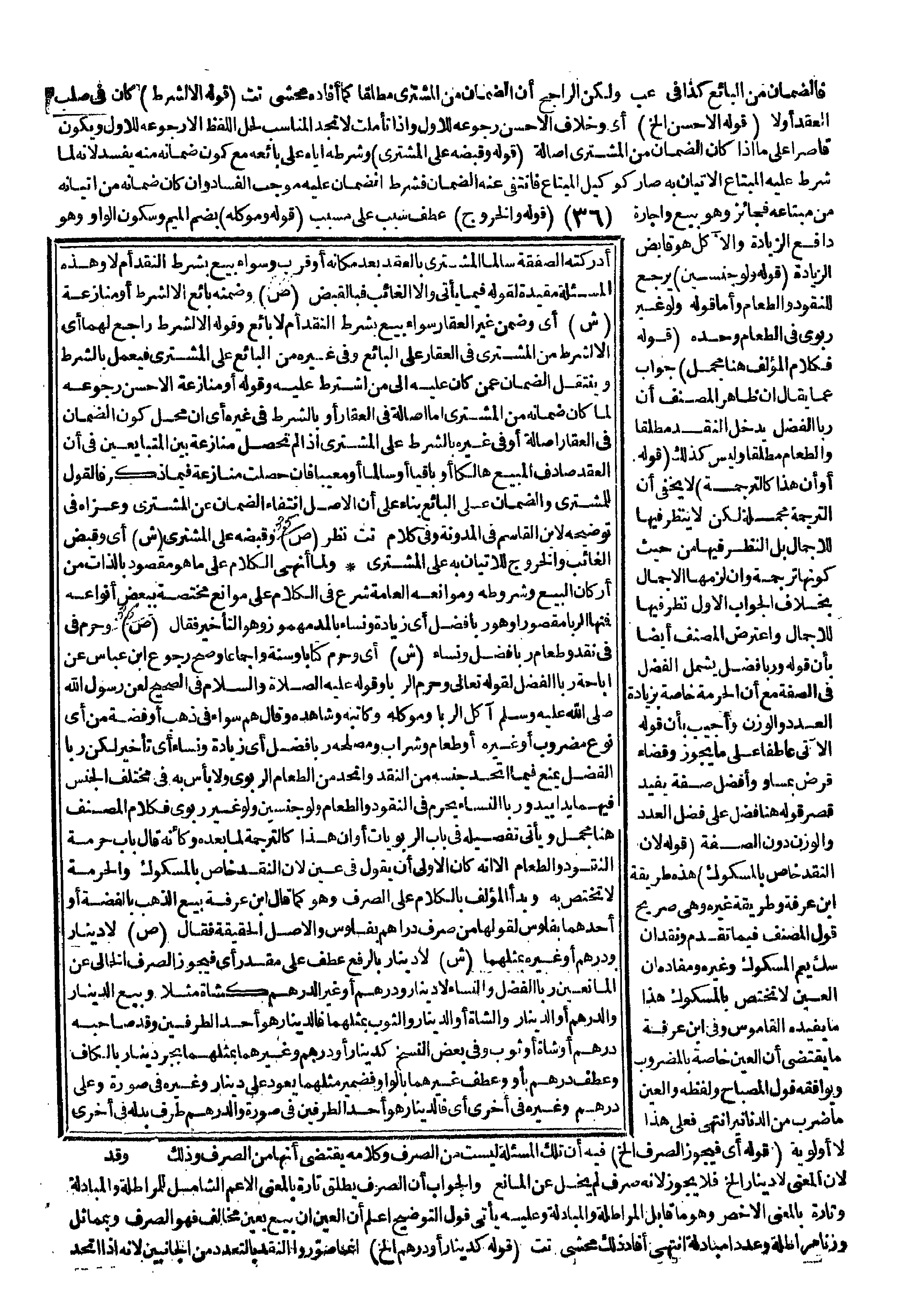وَلَمَّا أَنْهَى الْكَلَامَ عَلَى مَا هُوَ مَقْصُودٌ بِالذَّاتِ مِنْ أَرْكَانِ الْبَيْعِ وَشُرُوطِهِ وَمَوَانِعِهِ الْعَامَّةِ شَرَعَ فِي الْكَلَامِ عَلَى مَوَانِعَ مُخْتَصَّةٍ بِبَعْضِ أَنْوَاعِهِ فَمِنْهَا الرِّبَا مَقْصُورًا وَهُوَ رِبَا فَضْلٍ أَيْ زِيَادَةٍ وَنَسَاءٍ بِالْمَدِّ مَهْمُوزٌ وَهُوَ التَّأْخِيرُ فَقَالَ (ص) وَحَرُمَ فِي نَقْدٍ وَطَعَامٍ رِبَا فَضْلٍ وَنَسَاءٍ (ش) أَيْ وَحَرُمَ كِتَابًا وَسُنَّةً وَإِجْمَاعًا وَصَحَّ رُجُوعُ ابْنِ عَبَّاسٍ عَنْ إبَاحَةِ رِبَا الْفَضْلِ {وَحَرَّمَ الرِّبَا} [البقرة: 275] وَقَوْلُهُ - عَلَيْهِ الصَّلَاةُ وَالسَّلَامُ - فِي الصَّحِيحِ «لَعَنَ رَسُولُ اللَّهِ - صَلَّى اللَّهُ عَلَيْهِ وَسَلَّمَ - آكِلَ الرِّبَا وَمُوكِلَهُ وَكَاتِبَهُ وَشَاهِدَهُ وَقَالَ هُمْ سَوَاءٌ» فِي ذَهَبٍ أَوْ فِضَّةٍ مِنْ أَيِّ نَوْعٍ مَضْرُوبٍ أَوْ غَيْرِهِ أَوْ طَعَامٍ وَشَرَابٍ وَمَصْلَحَةٍ رِبَا فَضْلٍ أَيْ زِيَادَةٍ وَنَسَاءٍ أَيْ تَأْخِيرٍ لَكِنْ رِبَا الْفَضْلِ يُمْنَعُ فِيمَا اتَّحَدَ جِنْسُهُ مِنْ النَّقْدِ وَاتَّحَدَ مِنْ الطَّعَامِ الرِّبَوِيِّ وَلَا بَأْسَ بِهِ فِي مُخْتَلِفِ الْجِنْسِ فِيهِمَا يَدًا بِيَدٍ وَرِبَا النَّسَاءِ يَحْرُمُ فِي النُّقُودِ وَالطَّعَامِ، وَلَوْ جِنْسَيْنِ وَلَوْ غَيْرَ رِبَوِيٍّ.