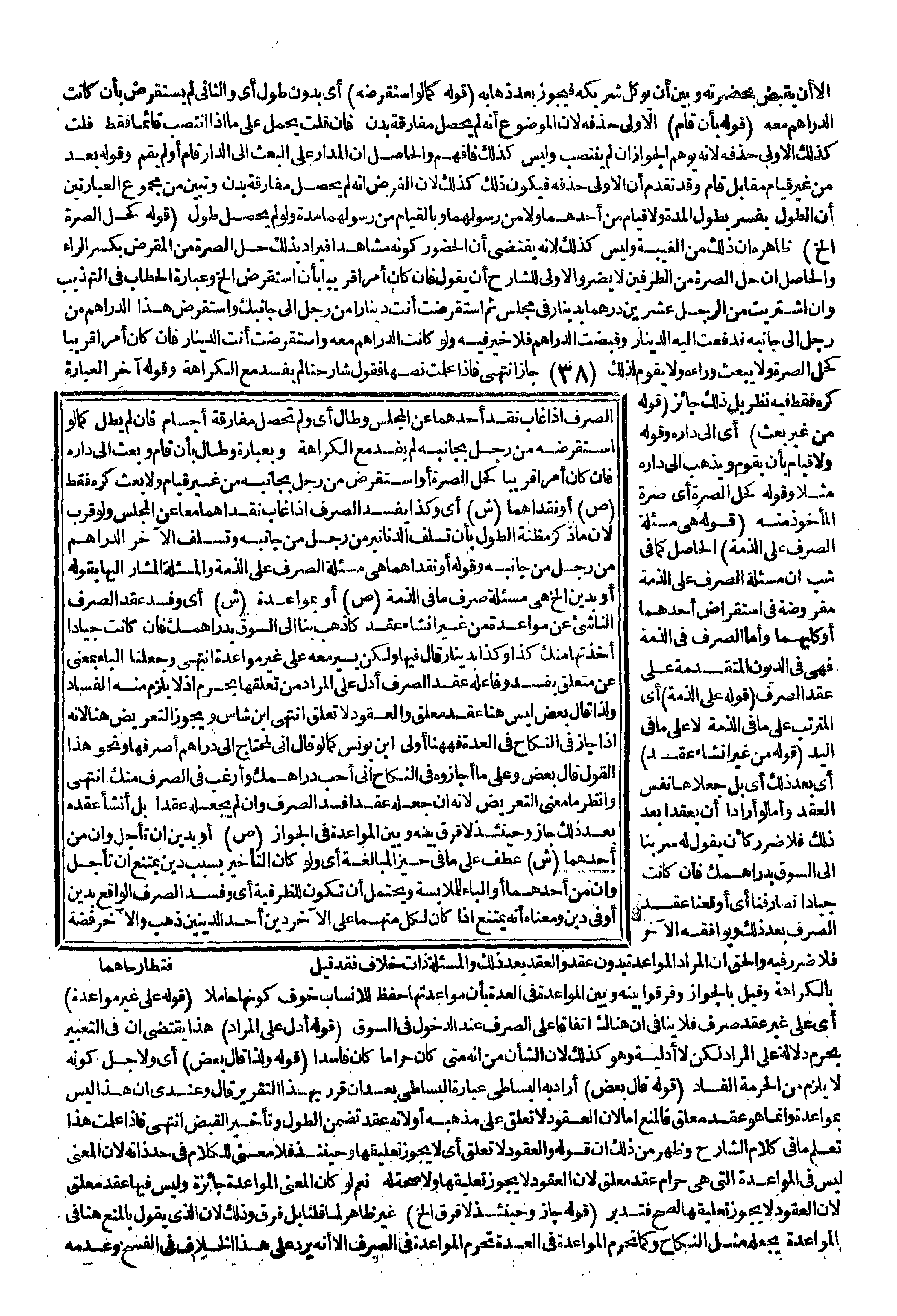 وَالْحَاصِلُ أَنَّ الْمَدَارَ عَلَى الْبَعْثِ إلَى الدَّارِ قَامَ أَوْ لَمْ يَقُمْ وَقَوْلُهُ بَعْدُ مِنْ غَيْرِ قِيَامٍ مُقَابِلُ قَامَ، وَقَدْ تَقَدَّمَ أَنَّ الْأَوْلَى حَذْفُهُ فَيَكُونُ ذَلِكَ كَذَلِكَ؛ لِأَنَّ الْفَرْضَ أَنَّهُ لَمْ يَحْصُلْ مُفَارَقَةُ بَدَنٍ وَتَبَيَّنَ مِنْ مَجْمُوعِ الْعِبَارَتَيْنِ أَنَّ الطُّولَ يُفَسَّرُ بِطُولِ الْمُدَّةِ وَلَا قِيَامَ مِنْ أَحَدِهِمَا وَلَا مِنْ رَسُولِهِمَا وَبِالْقِيَامِ مِنْ رَسُولِهِمَا مُدَّةً وَلَوْ لَمْ يَحْصُلْ طُولٌ (قَوْلُهُ كَحَلِّ الصُّرَّةِ إلَخْ) ظَاهِرُهُ أَنَّ ذَلِكَ مِنْ الْغَيْبَةِ وَلَيْسَ كَذَلِكَ؛ لِأَنَّهُ يَقْتَضِي أَنَّ الْحُضُورَ كَوْنُهُ مُشَاهَدًا فَيُرَادُ بِذَلِكَ حَلُّ الصُّرَّةِ مِنْ الْمُقْرِضِ بِكَسْرِ الرَّاءِ، وَالْحَاصِلُ أَنَّ حَلَّ الصُّرَّةِ مِنْ الطَّرَفَيْنِ لَا يَضُرُّ وَالْأَوْلَى لِلشَّارِحِ أَنْ يَقُولَ فَإِنَّهُ كَانَ أَمْرًا قَرِيبًا بِأَنْ اسْتَقْرَضَ إلَخْ وَعِبَارَةُ الْحَطَّابِ فِي التَّهْذِيبِ وَإِنْ اشْتَرَيْت مِنْ الرَّجُلِ عِشْرِينَ دِرْهَمًا بِدِينَارٍ فِي مَجْلِسٍ ثُمَّ اسْتَقْرَضْت أَنْتِ دِينَارًا مِنْ رَجُلٍ إلَى جَانِبِك وَاسْتَقْرَضَ هَذَا الدَّرَاهِمَ مِنْ رَجُلٍ إلَى جَانِبِهِ فَدَفَعْت إلَيْهِ الدِّينَارَ وَقَبَضْت الدَّرَاهِمَ فَلَا خَيْرَ فِيهِ، وَلَوْ كَانَتْ الدَّرَاهِمُ مَعَهُ وَاسْتَقْرَضْت أَنْتَ الدِّينَارَ فَإِنْ كَانَ أَمْرًا قَرِيبًا كَحَلِّ الصُّرَّةِ وَلَا يَبْعَثُ وَرَاءَهُ وَلَا يَقُومُ لِذَلِكَ جَازَ انْتَهَى فَإِذَا عَلِمْت نَصَّهَا فَقَوْلُ شَارِحِنَا لَمْ يَفْسُدْ مَعَ الْكَرَاهَةِ وَقَوْلُهُ آخِرَ الْعِبَارَةِ كُرِهَ فَقَطْ فِيهِ نَظَرٌ بَلْ ذَلِكَ جَائِزٌ.