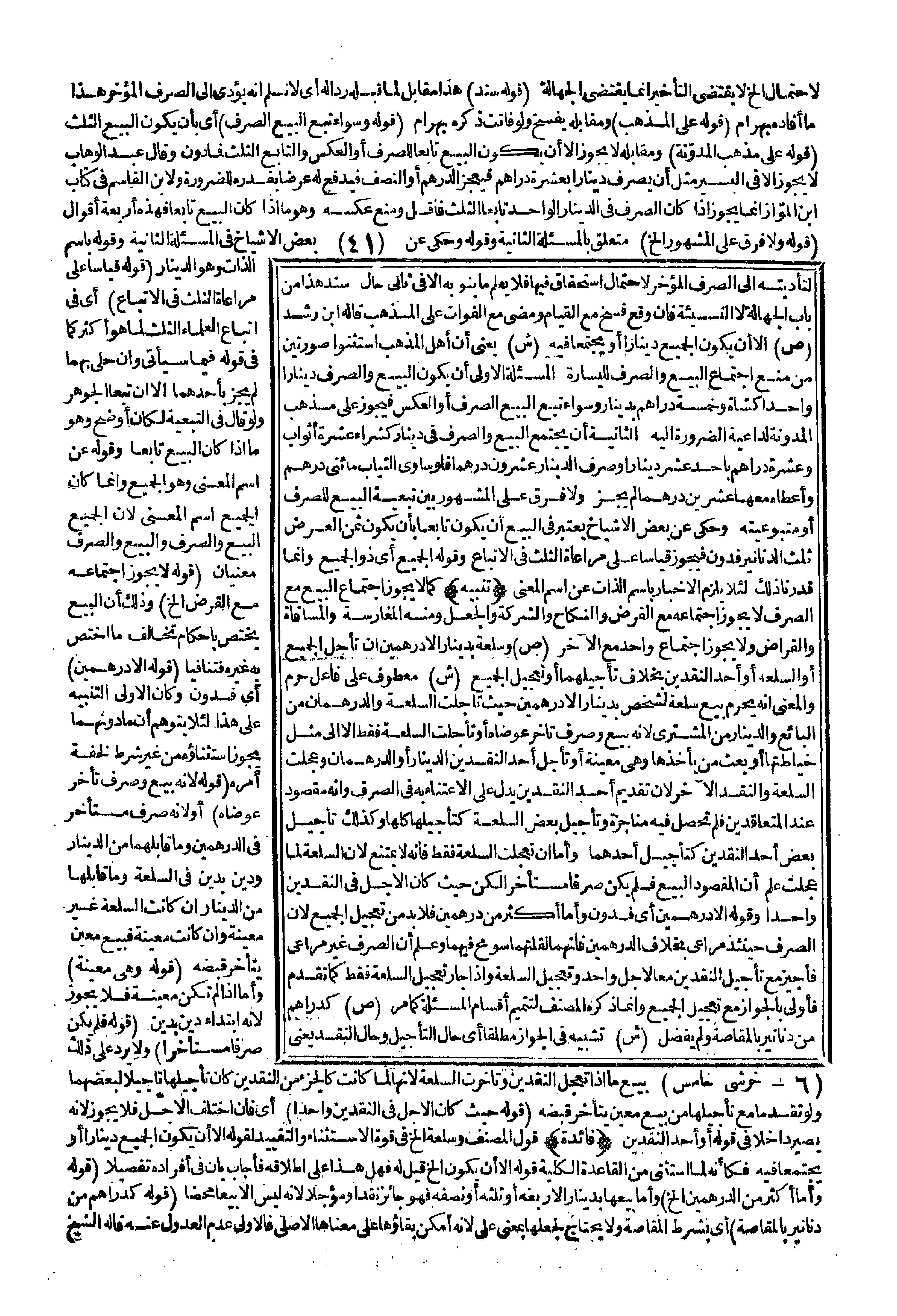 لِتَأْدِيَتِهِ إلَى الصَّرْفِ الْمُؤَخَّرِ لِاحْتِمَالِ اسْتِحْقَاقٍ فِيهَا فَلَا يُعْلَمُ مَا يَنُوبُهُ إلَّا فِي ثَانِي حَالٍ، سَنَدُ هَذَا مِنْ بَابِ الْجَهَالَةِ لَا النَّسِيئَةِ فَإِنْ وَقَعَ فَسْخٌ مَعَ الْقِيَامِ وَمَضَى مَعَ الْفَوَاتِ عَلَى الْمَذْهَبِ قَالَهُ ابْنُ رُشْدٍ (ص) إلَّا أَنْ يَكُونَ الْجَمِيعُ دِينَارًا أَوْ يَجْتَمِعَا فِيهِ (ش) يَعْنِي أَنَّ أَهْلَ الْمَذْهَبِ اسْتَثْنَوْا صُورَتَيْنِ مِنْ مَنْعِ اجْتِمَاعِ الْبَيْعِ وَالصَّرْفِ لِلْيَسَارَةِ الْمَسْأَلَةُ الْأُولَى أَنْ يَكُونَ الْبَيْعُ وَالصَّرْفُ دِينَارًا وَاحِدًا كَشَاةٍ وَخَمْسَةِ دَرَاهِمَ بِدِينَارٍ، وَسَوَاءٌ تَبِعَ الْبَيْعُ الصَّرْفَ أَوْ الْعَكْسُ فَيَجُوزُ عَلَى مَذْهَبِ الْمُدَوَّنَةِ لِدَاعِيَةِ الضَّرُورَةِ إلَيْهِ. الثَّانِيَةُ أَنْ يَجْتَمِعَ الْبَيْعُ وَالصَّرْفُ فِي دِينَارٍ كَشِرَاءِ عَشَرَةِ أَثْوَابٍ وَعَشَرَةِ دَرَاهِمَ بِأَحَدَ عَشَرَ دِينَارًا وَصَرْفُ الدِّينَارِ عِشْرُونَ دِرْهَمًا فَلَوْ سَاوَى الثِّيَابُ مِائَتَيْ دِرْهَمٍ وَأَعْطَاهُ مَعَهَا عِشْرِينَ دِرْهَمًا لَمْ يَجُزْ وَلَا فَرْقَ عَلَى الْمَشْهُورِ بَيْنَ تَبَعِيَّةِ الْبَيْعِ لِلصَّرْفِ أَوْ مَتْبُوعِيَّتِهِ وَحُكِيَ عَنْ بَعْضِ الْأَشْيَاخِ يُعْتَبَرُ فِي الْبَيْعِ أَنْ يَكُونَ تَابِعًا بِأَنْ يَكُونَ ثَمَنُ الْعَرْضِ ثُلُثَ الدَّنَانِيرِ فَدُونَ فَيَجُوزُ قِيَاسًا عَلَى مُرَاعَاةِ الثُّلُثِ فِي الِاتِّبَاعِ، وَقَوْلُهُ الْجَمِيعُ أَيْ ذُو الْجَمِيعِ، وَإِنَّمَا قَدَّرْنَا ذَلِكَ لِئَلَّا يَلْزَمَ الْإِخْبَارُ بِاسْمِ الذَّاتِ عَنْ اسْمِ الْمَعْنَى.