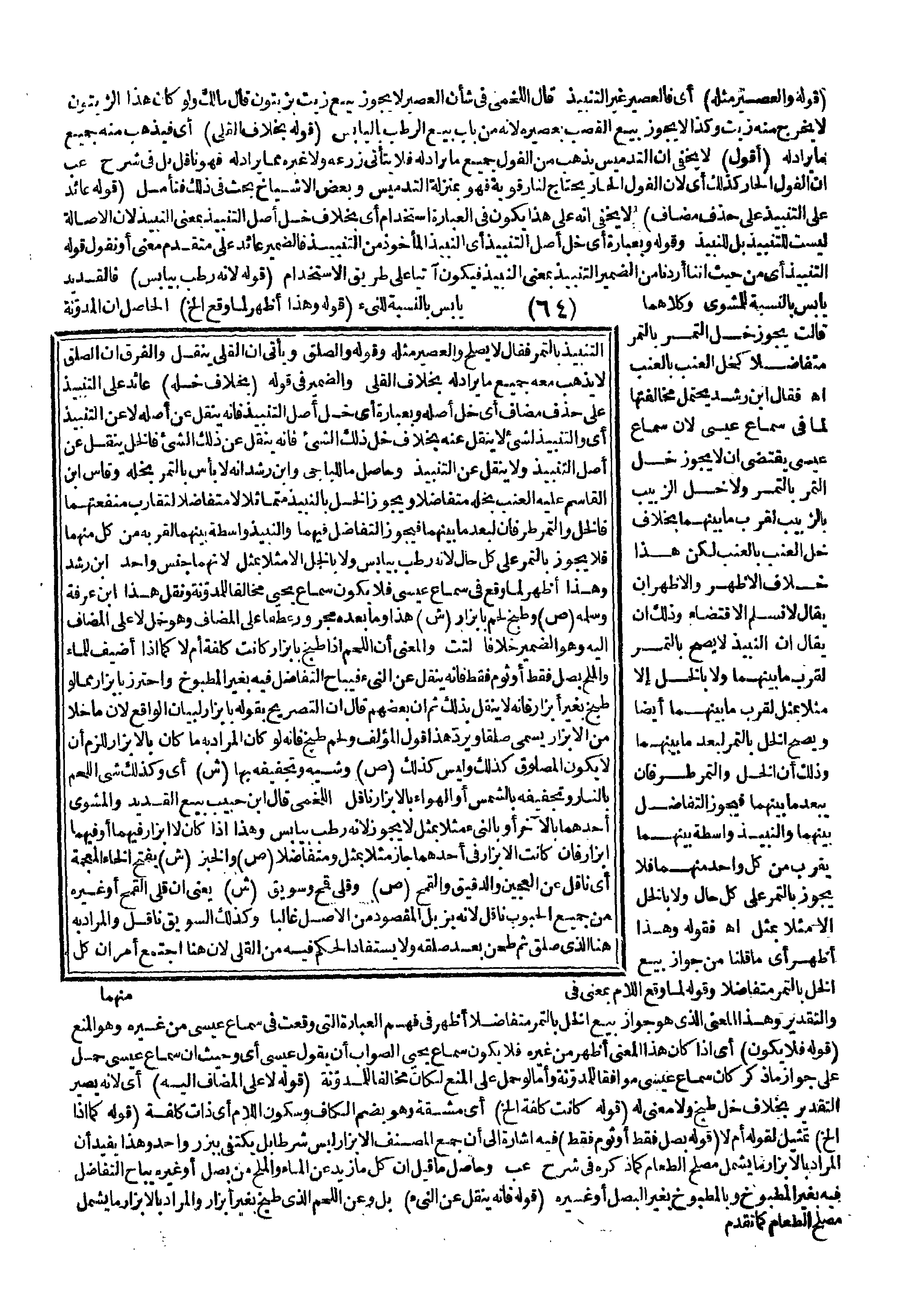 التَّنْبِيذِ بِالتَّمْرِ فَقَالَ: لَا يَصْلُحُ وَالْعَصِيرُ مِثْلُهُ وَقَوْلُهُ وَالصَّلْقُ وَيَأْتِي أَنَّ الْقَلْيَ يَنْقُلُ وَالْفَرْقُ أَنَّ الصَّلْقَ لَا يَذْهَبُ مَعَهُ جَمِيعُ مَا يُرَادُ لَهُ بِخِلَافِ الْقَلْيِ وَالضَّمِيرُ فِي قَوْلِهِ (بِخِلَافِ خَلِّهِ) عَائِدٌ عَلَى التَّنْبِيذِ عَلَى حَذْفِ مُضَافٍ أَيْ: خَلِّ أَصْلِهِ وَبِعِبَارَةٍ أَيْ: خَلِّ أَصْلِ التَّنْبِيذِ فَإِنَّهُ يَنْقُلُ عَنْ أَصْلِهِ لَا عَنْ التَّنْبِيذِ أَيْ وَالتَّنْبِيذُ لِشَيْءٍ لَا يَنْقُلُ عَنْهُ بِخِلَافِ خَلِّ ذَلِكَ الشَّيْءِ فَإِنَّهُ يَنْقُلُ عَنْ ذَلِكَ الشَّيْءِ فَالْخَلُّ يَنْقُلُ عَنْ أَصْلِ التَّنْبِيذِ وَلَا يَنْقُلُ عَنْ التَّنْبِيذِ وَحَاصِلُ مَا لِلْبَاجِيِّ وَابْنِ رُشْدٍ أَنَّهُ لَا بَأْسَ بِالتَّمْرِ بِخَلِّهِ وَقَاسَ ابْنُ الْقَاسِمِ عَلَيْهِ الْعِنَبَ بِخَلِّهِ مُتَفَاضِلًا وَيَجُوزُ الْخَلُّ بِالنَّبِيذِ مُتَمَاثِلًا لَا مُتَفَاضِلًا لِتَقَارُبِ مَنْفَعَتِهِمَا فَالْخَلُّ وَالتَّمْرُ طَرَفَانِ لِبُعْدِ مَا بَيْنَهُمَا فَيَجُوزُ التَّفَاضُلُ فِيهِمَا وَالنَّبِيذُ وَاسِطَةٌ بَيْنَهُمَا لِقُرْبِهِ مِنْ كُلٍّ مِنْهُمَا فَلَا يَجُوزُ بِالتَّمْرِ عَلَى كُلِّ حَالٍ؛ لِأَنَّهُ رَطْبٌ بِيَابِسٍ وَلَا بِالْخَلِّ إلَّا مِثْلًا بِمِثْلٍ؛ لِأَنَّهُمَا جِنْسٌ وَاحِدٌ ابْنُ رُشْدٍ وَهَذَا أَظْهَرُ لِمَا وَقَعَ فِي سَمَاعِ عِيسَى فَلَا يَكُونُ سَمَاعُ يَحْيَى مُخَالِفًا لِلْمُدَوَّنَةِ وَنَقَلَ هَذَا ابْنُ عَرَفَةَ وَسَلَّمَهُ