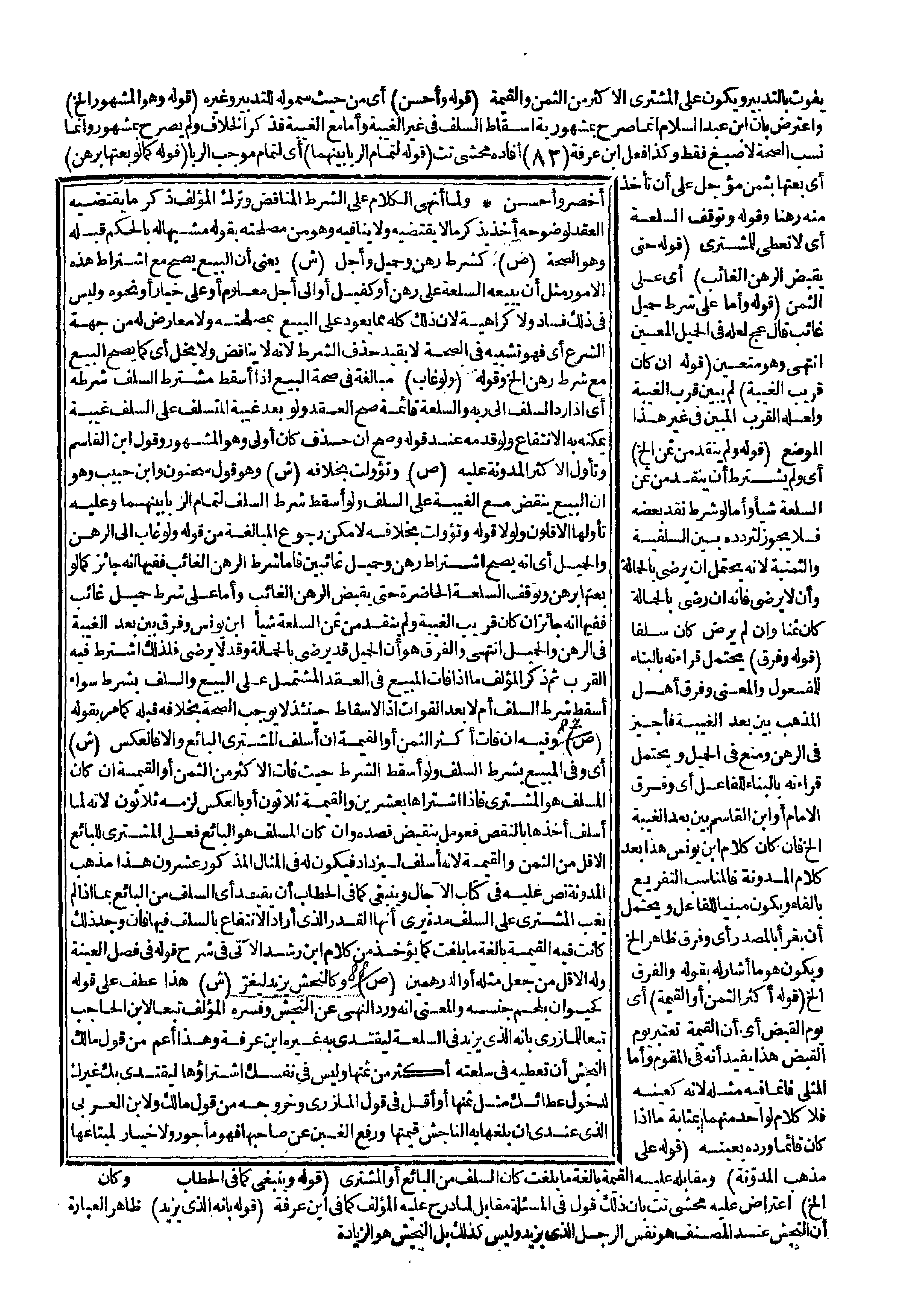 (ص) وَفِيهِ، إنْ فَاتَ أَكْثَرُ الثَّمَنِ، أَوْ الْقِيمَةِ، إنْ أَسْلَفَ الْمُشْتَرِي الْبَائِعَ وَإِلَّا فَالْعَكْسُ (ش) أَيْ: وَفِي الْمَبِيعِ بِشَرْطِ السَّلَفِ وَلَوْ أُسْقِطَ الشَّرْطُ حَيْثُ فَاتَ الْأَكْثَرُ مِنْ الثَّمَنِ، أَوْ الْقِيمَةِ، إنْ كَانَ الْمُسَلِّفُ هُوَ الْمُشْتَرِيَ فَإِذَا اشْتَرَاهَا بِعِشْرِينَ وَالْقِيمَةُ ثَلَاثُونَ، أَوْ بِالْعَكْسِ لَزِمَهُ ثَلَاثُونَ؛ لِأَنَّهُ لَمَّا أَسْلَفَ أَخَذَهَا بِالنَّقْصِ فَعُومِلَ بِنَقِيضِ قَصْدِهِ،
