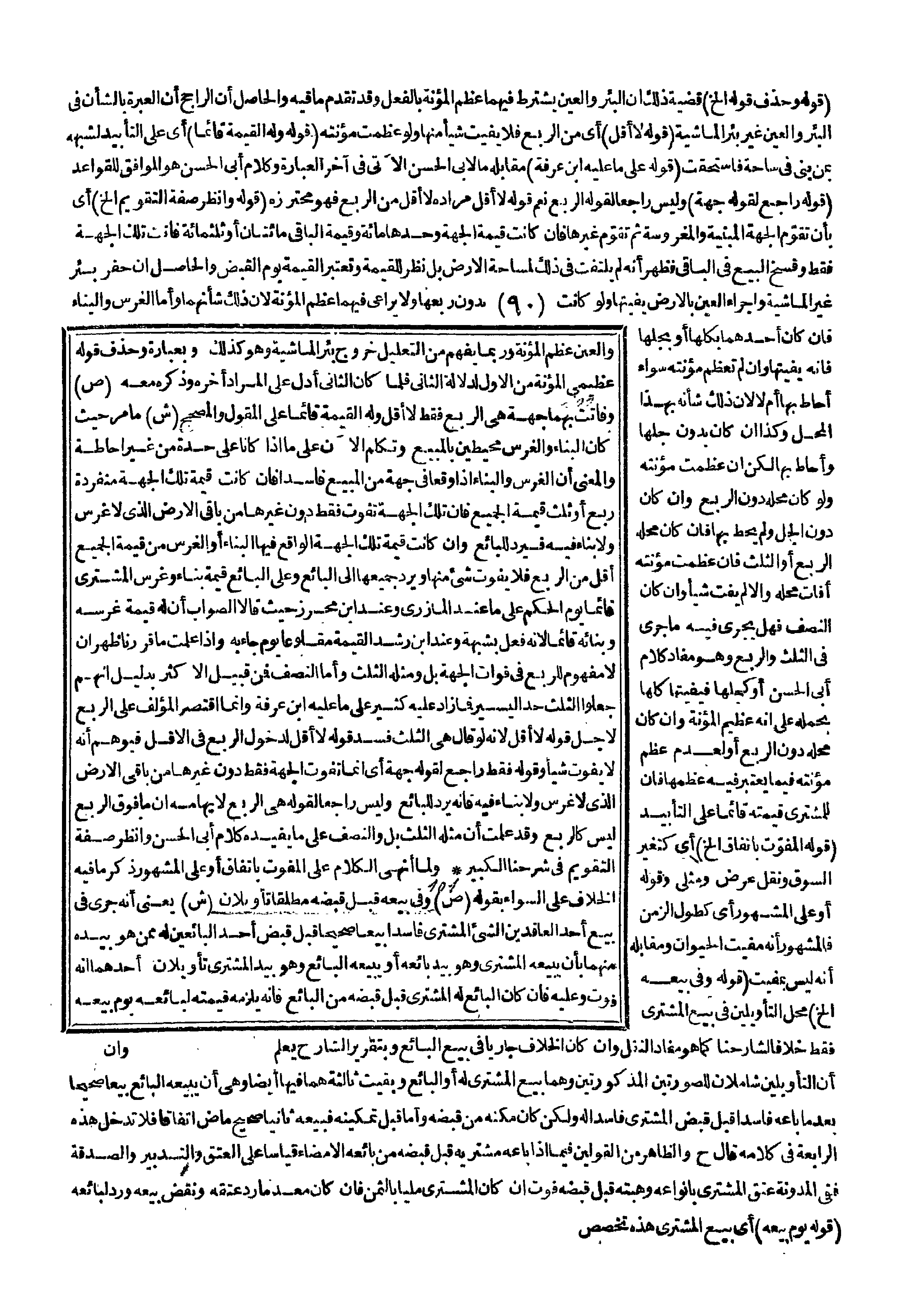 وَعِنْدَ ابْنِ مُحْرِزٍ حَيْثُ قَالَا الصَّوَابُ أَنَّ لَهُ قِيمَةَ غَرْسِهِ وَبِنَائِهِ قَائِمًا؛ لِأَنَّهُ فَعَلَ بِشُبْهَةٍ وَعِنْدَ ابْنِ رُشْدٍ الْقِيمَةُ مَقْلُوعًا يَوْمَ جَاءَ بِهِ وَإِذَا عَلِمْت مَا قَرَّرْنَا ظَهَرَ أَنْ لَا مَفْهُومَ لِلرُّبُعِ فِي فَوَاتِ الْجِهَةِ بَلْ وَمِثْلُهُ الثُّلُثُ وَأَمَّا النِّصْفُ فَمِنْ قَبِيلِ الْأَكْثَرِ بِدَلِيلِ أَنَّهُمْ جَعَلُوا الثُّلُثَ حَدَّ الْيَسِيرِ فَمَا زَادَ عَلَيْهِ كَثِيرٌ عَلَى مَا عَلَيْهِ ابْنُ عَرَفَةَ وَإِنَّمَا اقْتَصَرَ الْمُؤَلِّفُ عَلَى الرُّبُعِ لِأَجْلِ قَوْلِهِ لَا أَقَلُّ؛ لِأَنَّهُ لَوْ قَالَ: هِيَ الثُّلُثُ فَسَدَ قَوْلُهُ لَا أَقَلُّ لِدُخُولِ الرُّبُعِ فِي الْأَقَلِّ فَيُوهِمُ أَنَّهُ لَا يُفَوِّتُ شَيْئًا وَقَوْلُهُ فَقَطْ رَاجِعٌ لِقَوْلِهِ جِهَةً أَيْ: إنَّمَا تَفُوتُ الْجِهَةُ فَقَطْ دُونَ غَيْرِهَا مِنْ بَاقِي الْأَرْضِ الَّذِي لَا غَرْسَ وَلَا بِنَاءَ فِيهِ فَإِنَّهُ يَرُدُّ لِلْبَائِعِ وَلَيْسَ رَاجِعًا لِقَوْلِهِ هِيَ الرُّبُعُ لِإِيهَامِهِ أَنَّ مَا فَوْقَ الرُّبُعِ لَيْسَ كَالرُّبُعِ وَقَدْ عَلِمْت أَنَّ مِثْلَهُ الثُّلُثُ بَلْ وَالنِّصْفُ عَلَى مَا يُفِيدُهُ كَلَامُ أَبِي الْحَسَنِ وَانْظُرْ صِفَةَ التَّقْوِيمِ فِي شَرْحِنَا الْكَبِيرِ