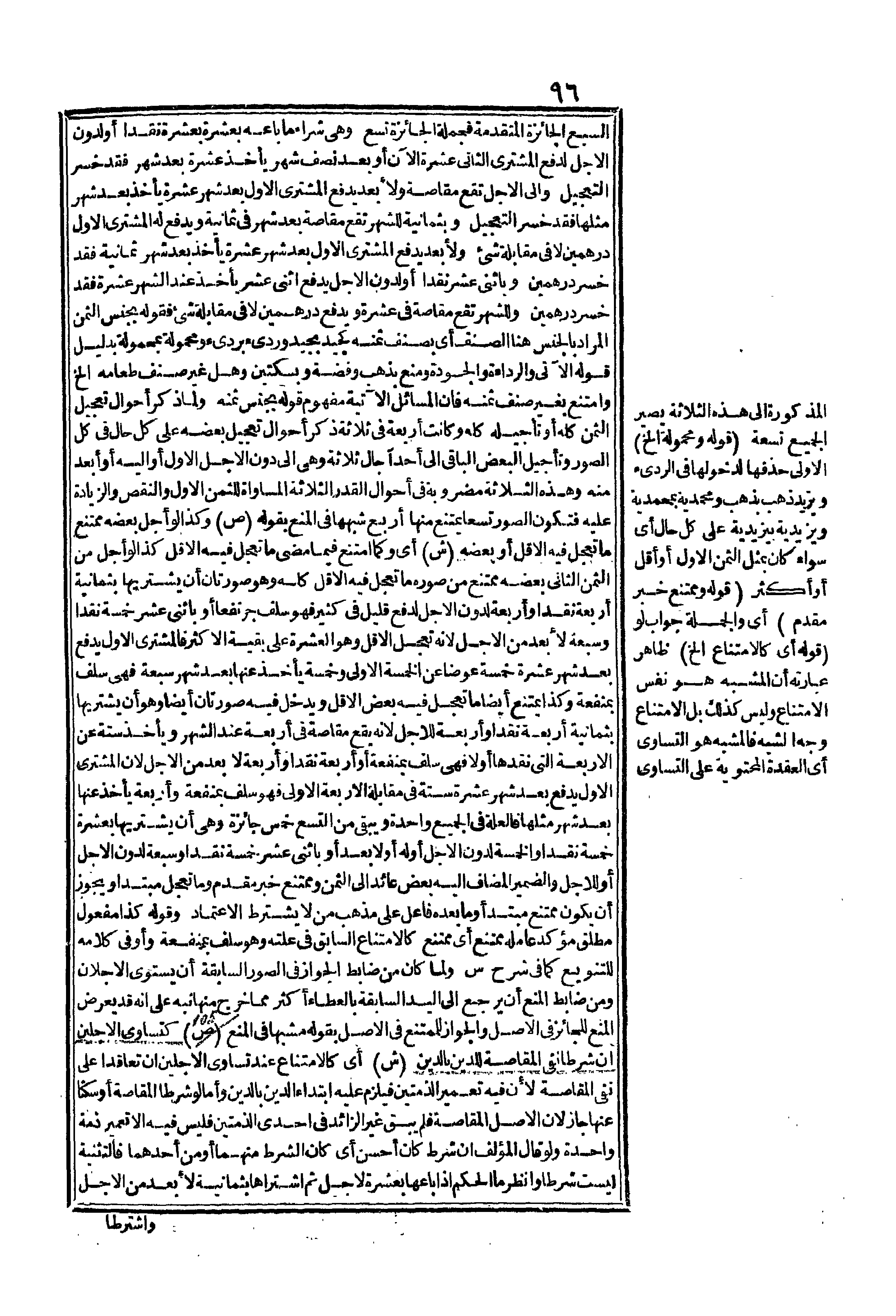 وَلَمَّا ذَكَرَ أَحْوَالَ تَعْجِيلِ الثَّمَنِ كُلِّهِ، أَوْ تَأْجِيلِهِ كُلِّهِ وَكَانَتْ أَرْبَعَةً فِي ثَلَاثَةٍ ذَكَرَ أَحْوَالَ تَعْجِيلِ بَعْضِهِ عَلَى كُلِّ حَالٍ فِي كُلِّ الصُّوَرِ وَتَأْجِيلِ الْبَعْضِ الْبَاقِي إلَى أَحَدِ آجَالٍ ثَلَاثَةٍ وَهِيَ إلَى دُونِ الْأَجَلِ الْأَوَّلِ، أَوْ إلَيْهِ، أَوْ أَبْعَدَ مِنْهُ وَهَذِهِ الثَّلَاثَةُ مَضْرُوبَةٌ فِي أَحْوَالِ الْقَدْرِ الثَّلَاثَةِ الْمُسَاوَاةِ لِلثَّمَنِ الْأَوَّلِ وَالنَّقْصِ وَالزِّيَادَةِ عَلَيْهِ فَتَكُونُ الصُّوَرُ تِسْعًا يَمْتَنِعُ مِنْهَا أَرْبَعٌ شَبَّهَهَا فِي الْمَنْعِ بِقَوْلِهِ