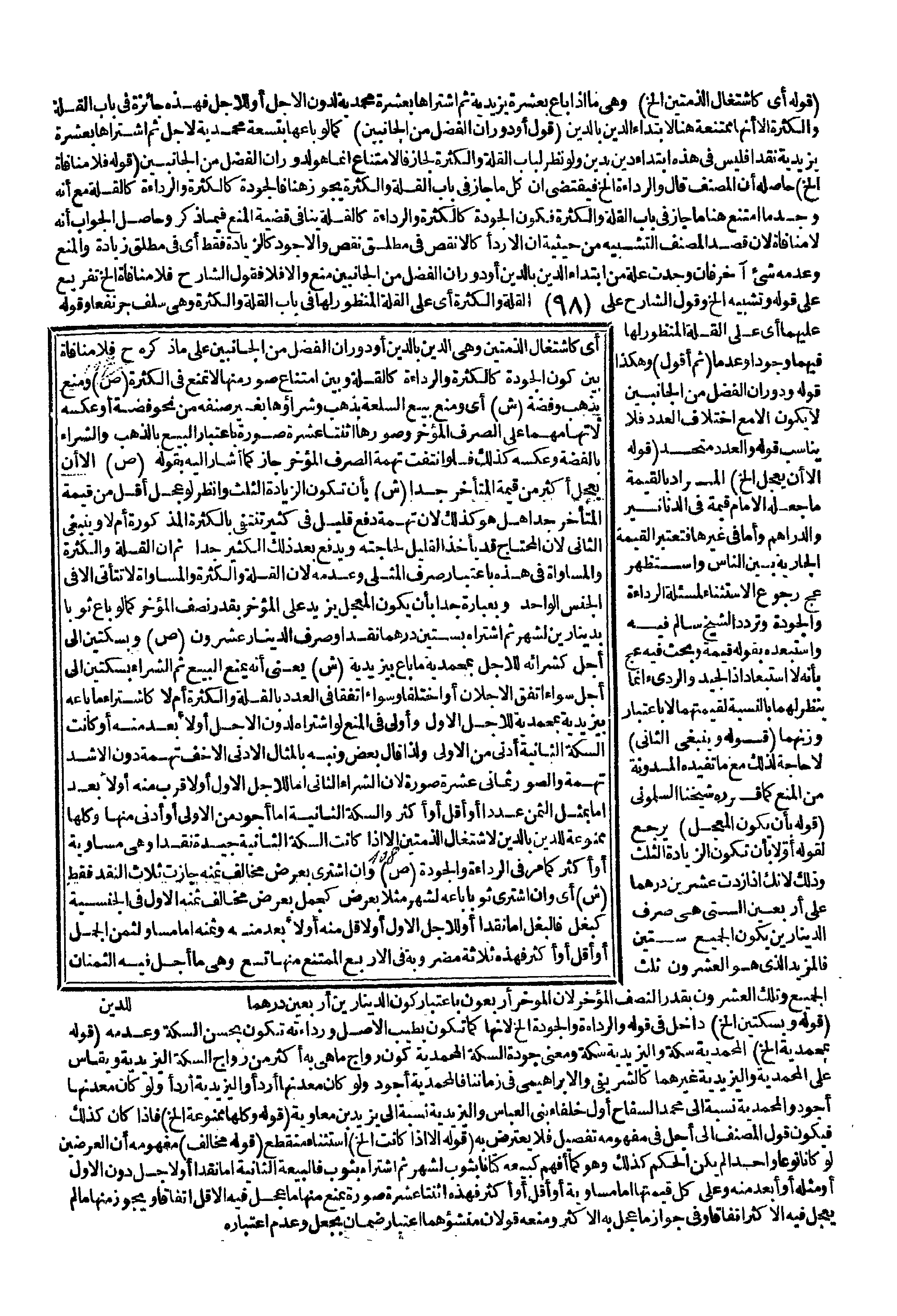 أَيْ: كَاشْتِغَالِ الذِّمَّتَيْنِ وَهِيَ الدَّيْنُ بِالدَّيْنِ، أَوْ دَوْرَانِ الْفَضْلِ مِنْ الْجَانِبَيْنِ عَلَى مَا ذَكَرَهُ ح فَلَا مُنَافَاةَ بَيْنَ كَوْنِ الْجَوْدَةِ كَالْكَثْرَةِ وَالرَّدَاءَةِ كَالْقِلَّةِ وَبَيْنَ امْتِنَاعِ صُوَرٍ مِنْهَا لَا تُمْنَعُ فِي الْكَثْرَةِ