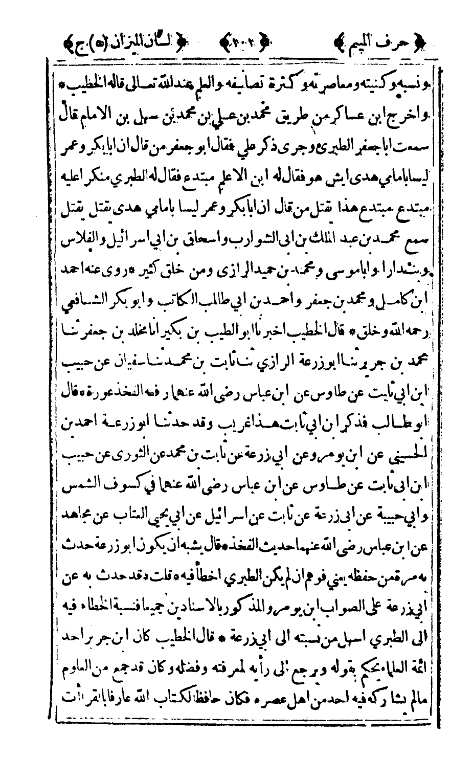 ونسبه وكنيته ومعاصرته وكثرة تصانيفه والعلم عند الله تعالى قاله الخطيب واخرج بن عساكر من طريق محمد بن علي بن محمد بن سهل بن الإمام قال سمعت أبا جعفر الطبري وجرى ذكر علي فقال أبو جعفر من قال: إن أبا بكر وعمر ليسا بامامي هدى أيش هو فقال له ابن الأعلم: مبتدع فقال له الطبري: منكرا عليه مبتدع مبتدع هذا يقتل من قال إن أبا بكر وعمر ليسا بامامي هدى يقتل يقتل سمع محمد بن عبد الملك بن أبي الشوارب وإسحاق بن أبي إسرائيل والفلاس وبندارا وأبا موسى ومحمد بن حميد الرازي ومن خلق كثير روى عنه أحمد بن كامل ومحمد بن جعفر وأحمد بن أبي طالب الكاتب وأبو بكر الشافعي رحمه الله وخلق قال الخطيب أخبرنا أبو الطيب بن بكير أنا مخلد بن جعفر ثنا محمد بن جرير ثنا أبو زرعة الرازي ثنا ثابت بن محمد ثنا سفيان عن حبيب بن أبي ثابت عن طاوس عن ابن عباس رضى الله عنهما رفعه الفخذ عورة قال أبو طالب فذكر بن أبي ثابت هذا غريب وقد حدثنا أبو زرعة أحمد بن الحسيني عن ابن يومر وعن أبي زرعة بن ثابت بن محمد عن الثوري عن حبيب بن أبي ثابت عن طاوس عن ابن عباس رضى الله عنهما في كسوف الشمس وأبي حبيبة عن أبي زرعة عن ثابت عن إسرائيل عن أبي يحيى العتاب عن مجاهد عن ابن عباس رضى الله عنهما حديث الفخذ قال يشبه أن يكون أبو زرعة حدث به مرة من حفظه مني فوهم أن لم يكن الطبري أخطأ فيه قلت: قد حدث به عن أبي زرعة على الصواب بن يومر والمذكور بالإسنادين جميعا فنسبة الخطاء فيه إلى الطبري أسهل من نسبته إلى أبي زرعة قال الخطيب كان ابن جرير أحد أئمة العلماء يحكم بقوله ويرجع إلى رأيه لمعرفته وفضله وكان قد جمع من العلوم ما لم يشاركه فيه أحد من أهل عصره فكان حافظا لكتاب الله عارفا بالقراءات