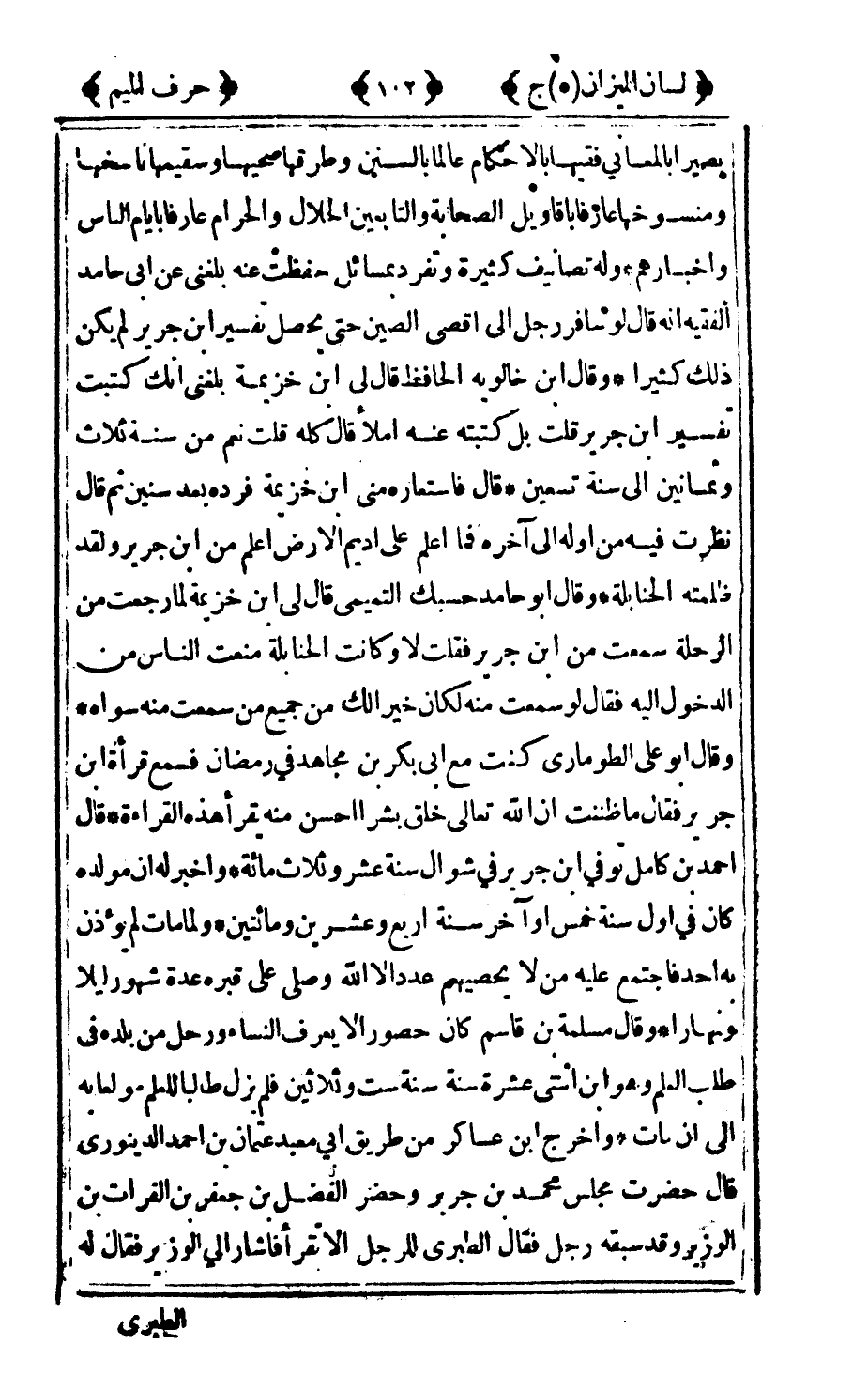 بصيرا بالمعاني فقيها بالأحكام عالما بالسنن وطرقها صحيحها وسقيمها ناسخها ومنسوخها عارفا باقاويل الصحابة والتابعين الحلال والحرام عارفا بأيام الناس وأخبارهم وله تصانيف كثيرة وتفرد بمسائل حفظت عنه بلغني عن أبي حامد الفقيه أنه قال لو سافر رجل إلى أقصى الصين حتى يحصل تفسير بن جرير لم يكن ذلك كثيرا وقال ابن خالويه الحافظ قال لي بن خزيمة بلغني انك كتبت تفسير بن جرير قلت: بل كتبته عنه املأ قال كله قلت: نعم من سنة ثلاث وثمانين إلى سنة تسعين قال فاستعاره مني بن خزيمة فرده بعد سنين ثم قال نظرت فيه من أوله إلى آخره فما اعلم على أديم الأرض اعلم من بن جرير ولقد ظلمته الحنابلة وقال أبو حامد حسبك التميمي قال لي بن خزيمة لما رجعت من الرحلة سمعت من بن جرير فقلت لا وكانت الحنابلة منعت الناس من الدخول إليه فقال: لو سمعت منه لكان خيرا لك من جميع من سمعت منه سواه وقال أبو علي الطوماري كنت مع أبي بكر بن مجاهد في رمضان فسمع قرأة بن جرير فقال: ما ظننت أن الله تعالى خلق بشرا أحسن منه يقرأ هذه القراءة قال أحمد بن كامل توفي بن جرير في شوال سنة عشر وثلاث مائة وأخبر له أن مولده كان في أول سنة خمس أو آخر سنة أربع وعشرين ومائتين ولما مات لم يؤذن به أحد فاجتمع عليه من لا يحصيهم عدد إلا الله وصلى على قبره عدة شهور ليلا ونهارا وقال مسلمة بن قاسم كان حصورا لا يعرف النساء ورحل من بلده في طلب العلم وهو ابن اثنتي عشرة سنة سنة ست وثلاثين فلم يزل طالبا للعلم مولعا به إلى أن مات وأخرج بن عساكر من طريق أبي معبد عثمان ابن أحمد الدينوري قال حضرت مجلس محمد بن جرير وحضر الفضل بن جعفر بن الفرات بن الوزير وقد سبقه رجل فقال الطبري للرجل: إلا تقرأ فأشار الي الوزير فقال له: