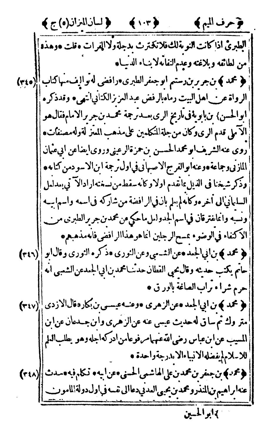 345 - "محمد" بن جرير بن رستم أبو جعفر الطبري رافضي له تواليف منها كتاب الرواة عن أهل البيت رماه بالرفض عبد العزيز الكتاني انتهى وقد ذكره أبو الحسن1 بن بأبويه في تاريخ الري بعد ترجمة محمد بن جرير الإمام فقال: هو الآملي قدم الري وكان من جلة المتكلمين على مذهب المعتزلة وله مصنفات روى عنه الشريف أبو محمد الحسن بن حمزة الرعيني وروى أيضا عن أبي عثمان المازني وجماعة وعنه أبو الفرج الأصبهاني في أول ترجمة بن الأسود من كتابه وذكر شيخنا في الذيل بما تقدم أولا وكأنه سقط من نسخته أراد الآتي بعد لعل السليماني إلى آخره وكأنه لم يعلم بان في الرافضة من شاركه في اسمه واسم أبيه ونسبه وإنما يفترقان في اسم الجد ولعل ما حكي عن محمد بن جرير الطبري من الاكتفاء في الوضوء بمسح الرجلين إنما هو هذا الرافضي فإنه مذهبهم.