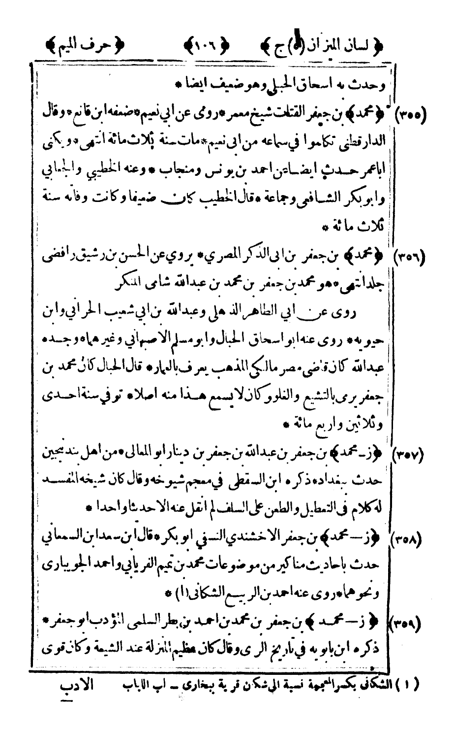 359 - "ز - محمد" بن جعفر بن محمد بن أحمد بن بطر السلمي المؤدب أبو جعفر ذكره ابن بأبويه في تاريخ الري وقال كان عظيم المنزلة عند الشيعة وكان قوي